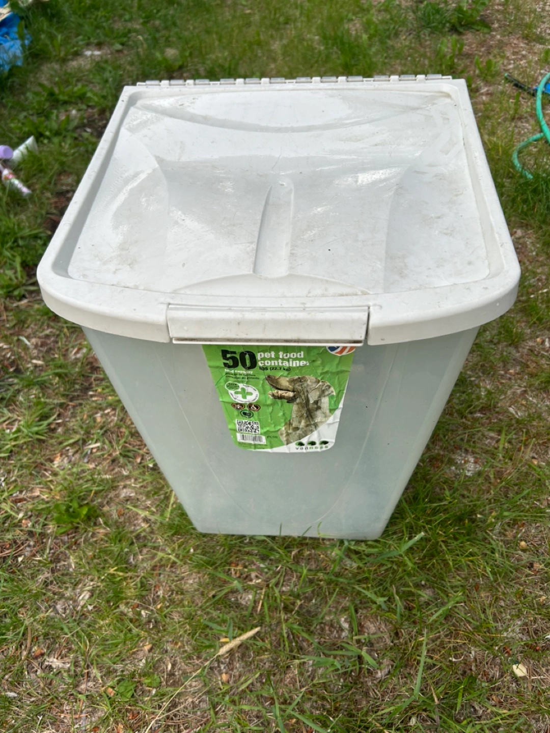 37Plastic Dog food storage container on wheels Has snap shut lid Cash please . Delivery/meet up to Leduc, Beaumont or s.Edmonton