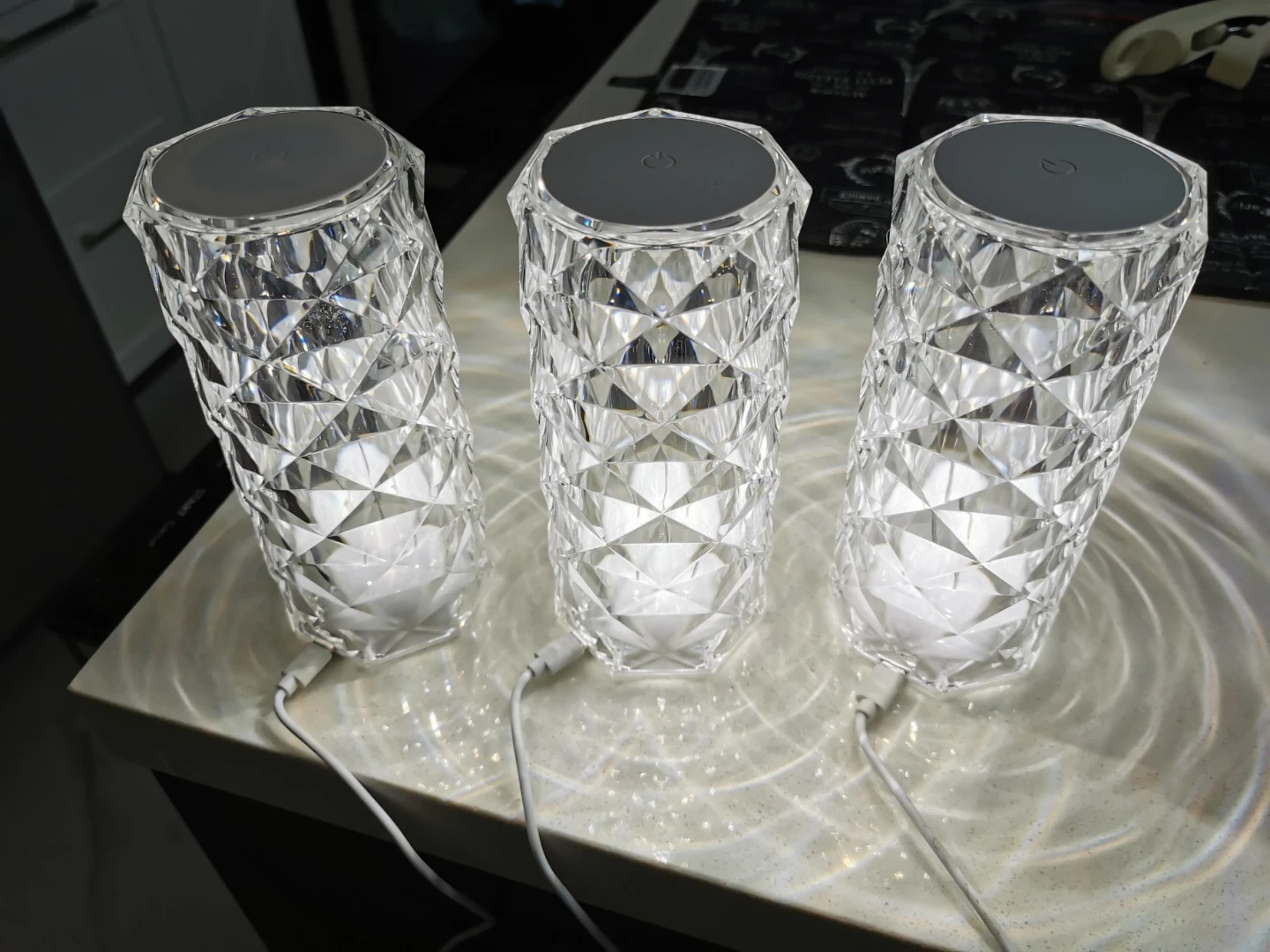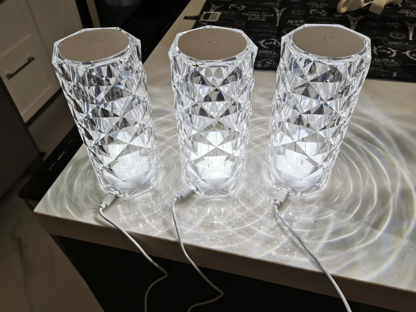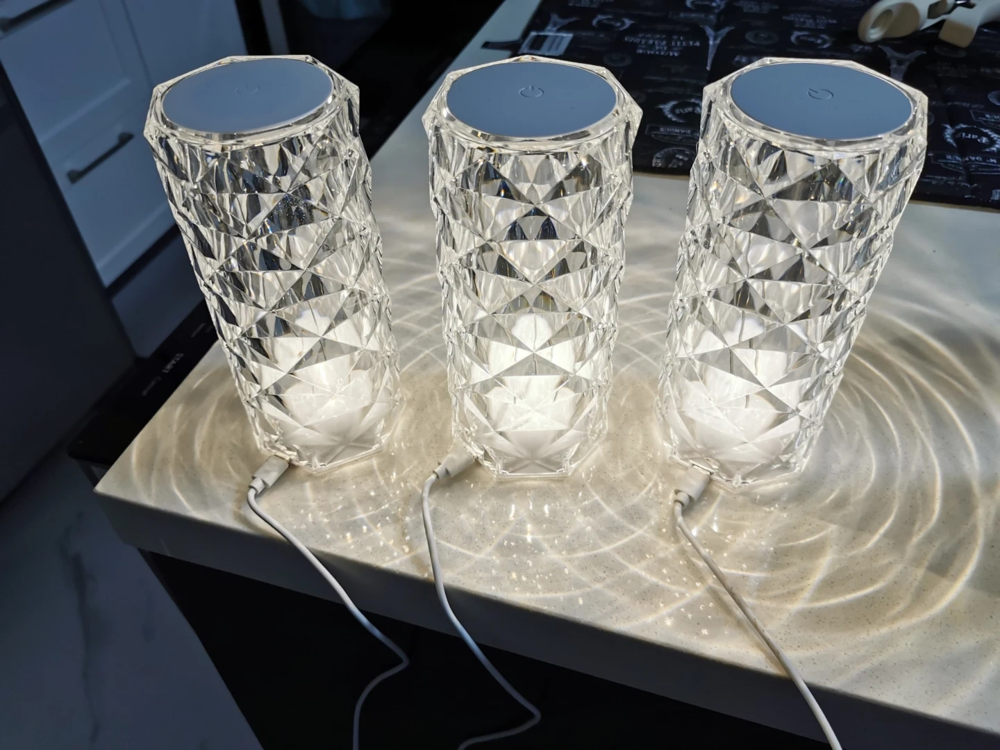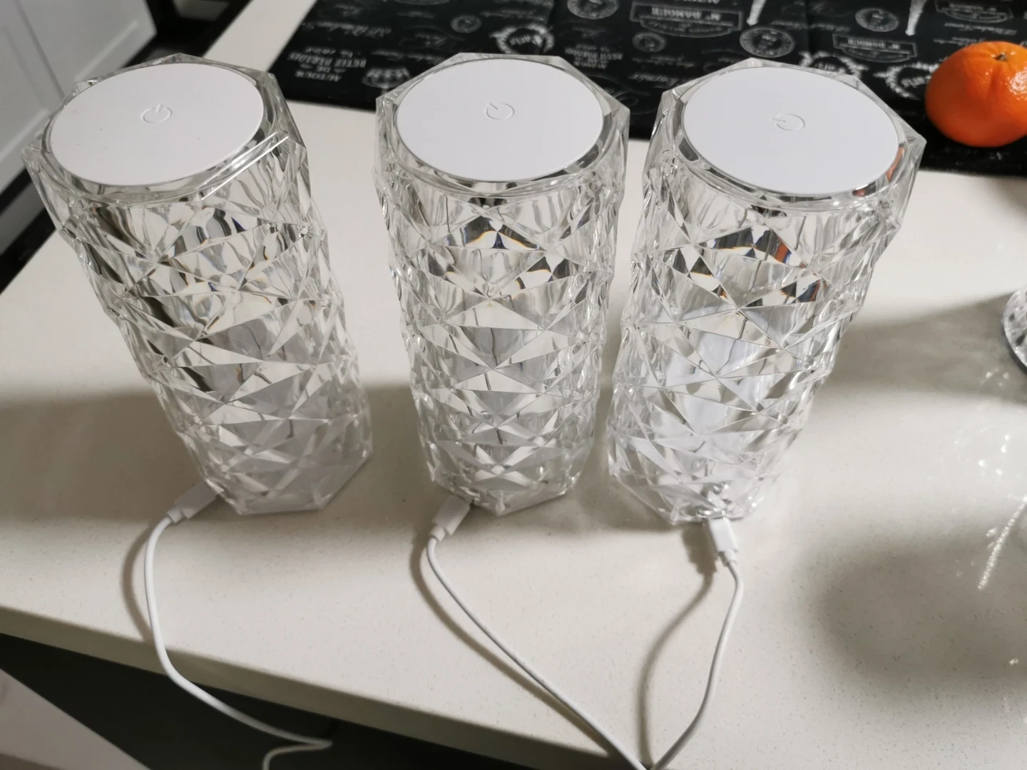 65Here are some really nice plastic crystal table lamps! They have a unique design that casts a beautiful light pattern. They're USB powered, so you can plug them into any USB port. They're in great condition and would look great in any room. Set of 3.
