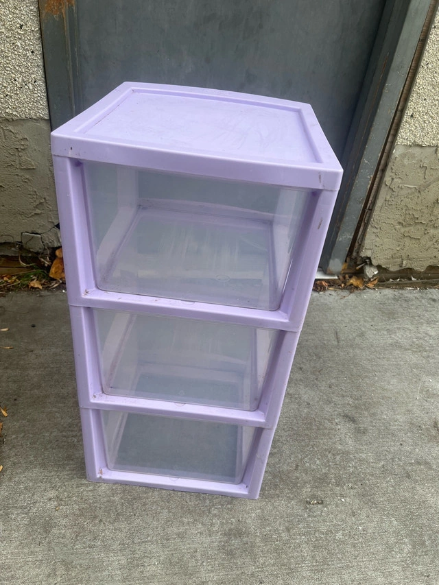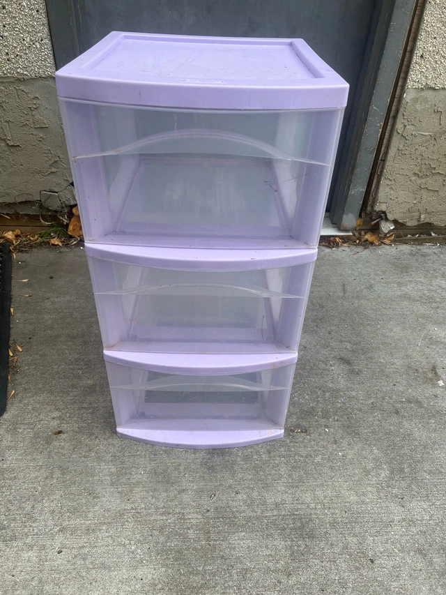 10This is a used purple plastic 3-drawer set, perfect for organizing your space with a touch of whimsy! Each drawer glides smoothly, ready to house your crafts, accessories. This unit is lightweight yet sturdy enough to handle everyday items. * Three spacious drawers * Durable plastic construction * Easy to clean * Compact design Looking to add a splash of colour and order to your humble abode? Look no further! If the ad is still posted, yes, it's still available—don't miss out!