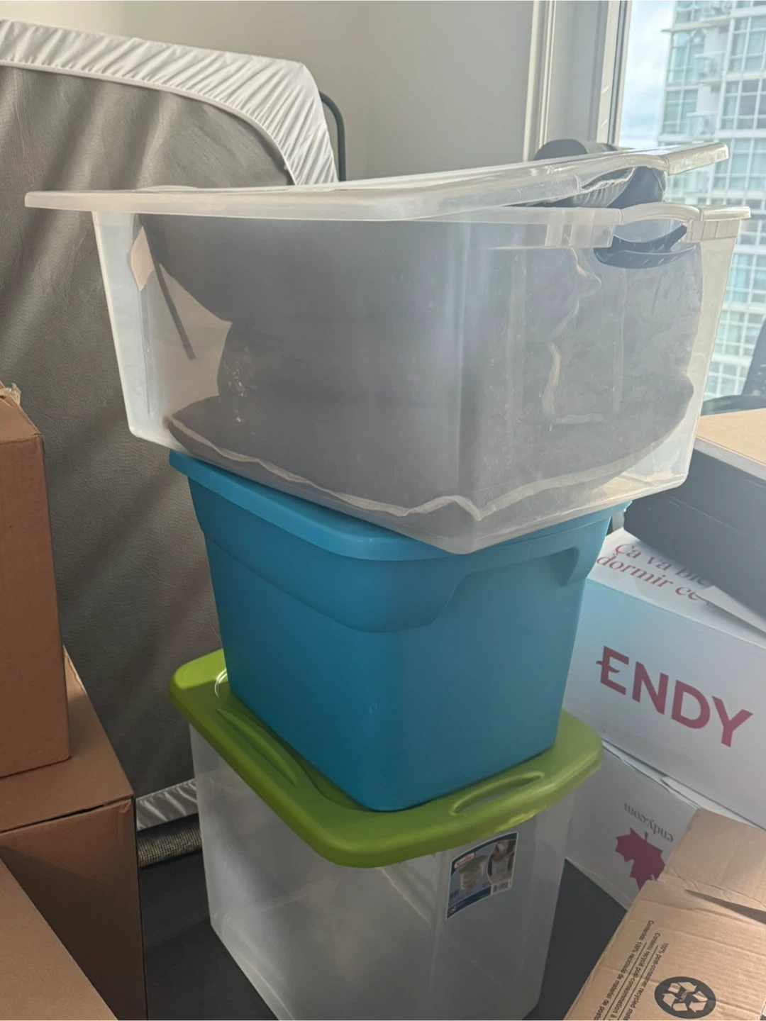 684dollars per box Selling a set of plastic storage bins, perfect for moving or organizing! They're in great shape and ready to help you pack up your belongings. Different sizes, including a clear one on top, a blue one in the middle, and a green-lidded one at the bottom