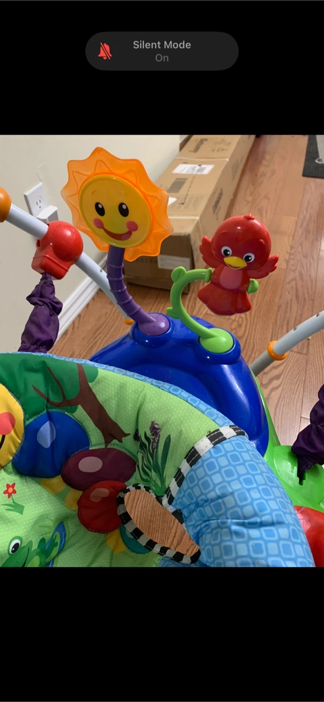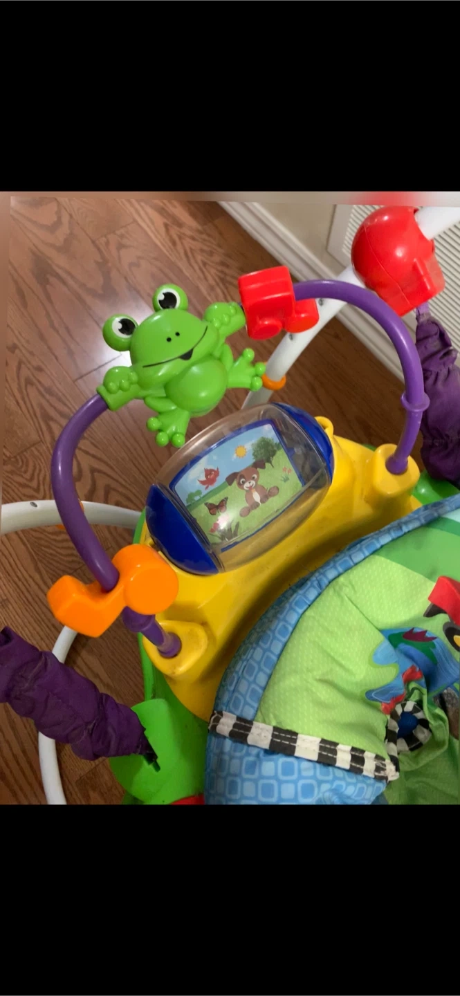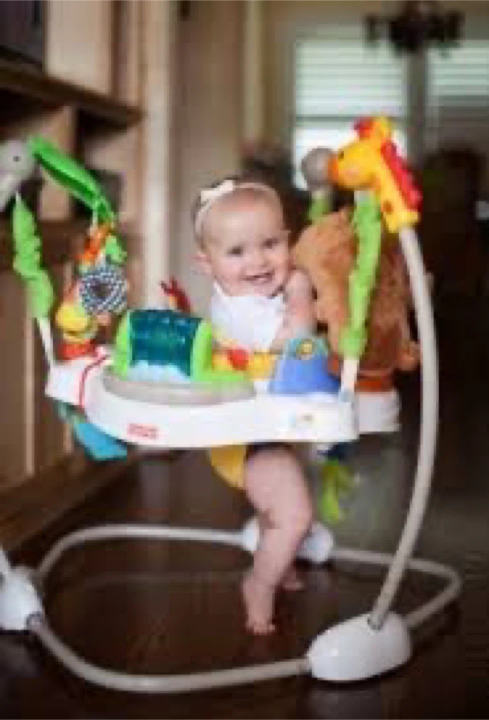 Play Bouncer with Toys, Lights, Sounds for Babies * Jungle-themed infant activity center that rewards your baby’s every jump with fun, toys have fun feel and sounds * Play with activities all around: bird-at leafs, sun spinner, frog roller ball, lion mirror, peek-a-boo dogs, bobble clouds * Plus a machine-washable seat pad for easy cleanup * Helps strengthen gross motor skills and engages developing senses of sight, hearing and touch Baby’s jump play centre is here to deliver the joy! Jump into cause & effect and role play fun with the Fun Activity Jumper. The 4 themed toy stations serve up endless entertainment for your little kid. Deliver with peek-a-boo play! Give the gift of pretend play all year long! Features a machine washable seat pad and wipeable toys for easy cleaning. Ages 6-12 months or up to 25 pounds Entertain and give your baby some fun! They will be quiet and have fun and be entertained while playing with toys and bouncing up and down in the bouncy play centre. Can be picked up or delivered Cheap - message me