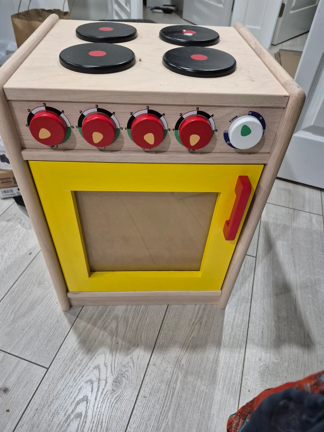 5I'm selling an play kitchen. It's in great condition and perfect for little chefs to explore their culinary creativity! It features a stove top, oven, and knobs that click when turned, just like a real kitchen also some utensils too