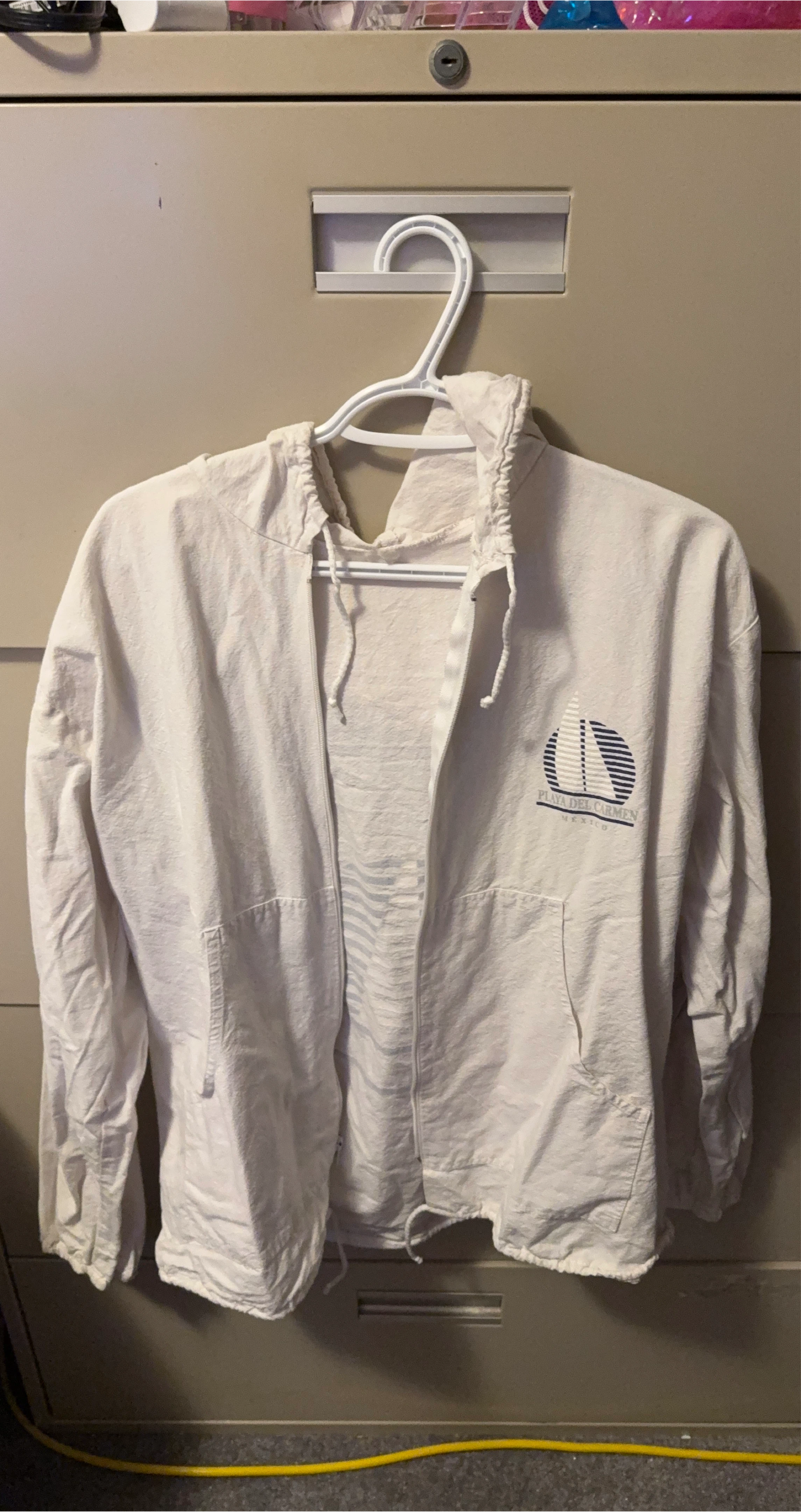 60Selling a white zip-up hoodie with the Playa Del Carmen logo. It's in great condition and perfect for layering on cooler days. The material is lightweight and comfortable, making it ideal for casual wear