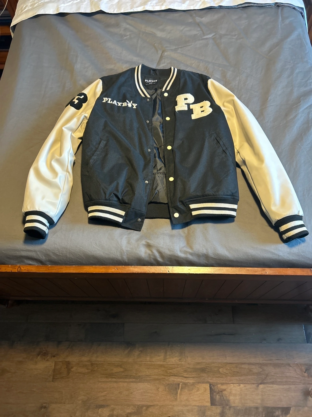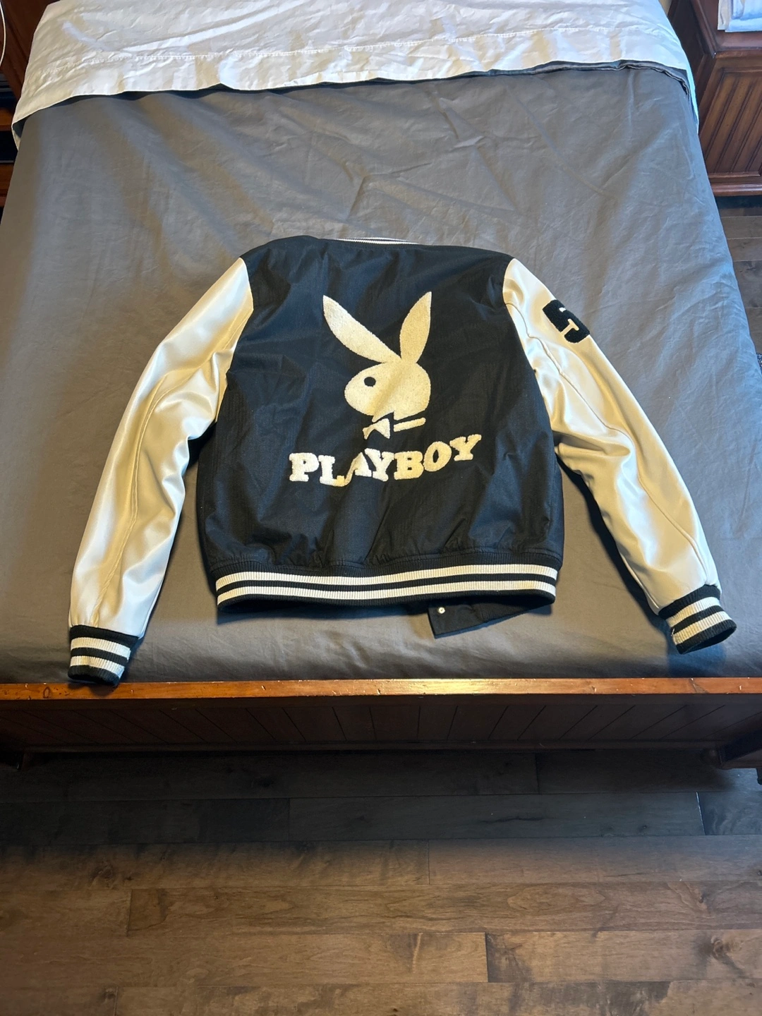 Prefect condition. Black and off-white varsity jacket. Features the Playboy bunny logo on the back. Snap button closure. Classic varsity style. Meeting location: agreed upon location OR 95 Oak Walk Dr, Oakville, ON (Small parking lot off of Post Rd.)
