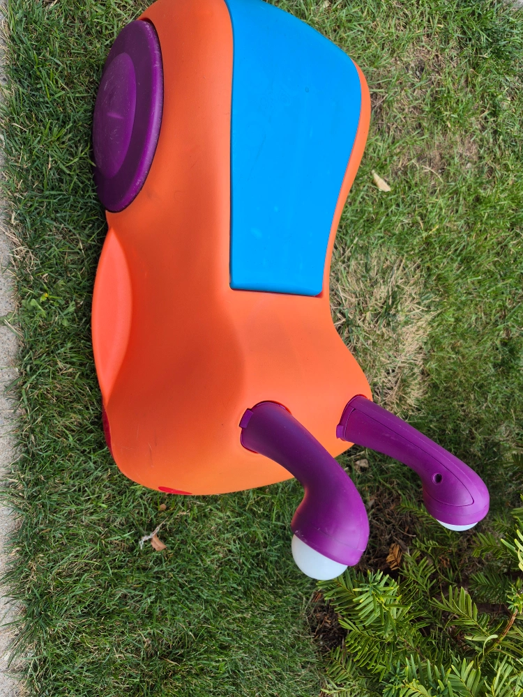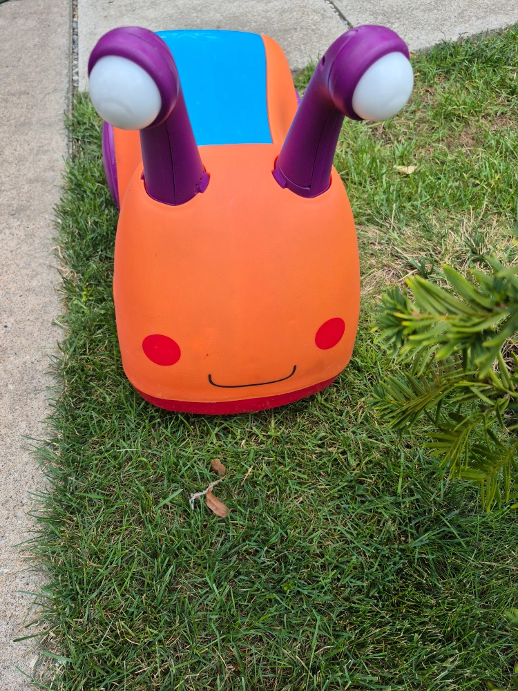 This is a Playskool Explore 'N Grow Busy Gears Ride-On toy. It's in great condition and ready for a new home! It's orange, blue, and purple and has a cute snail design. Perfect for toddlers!