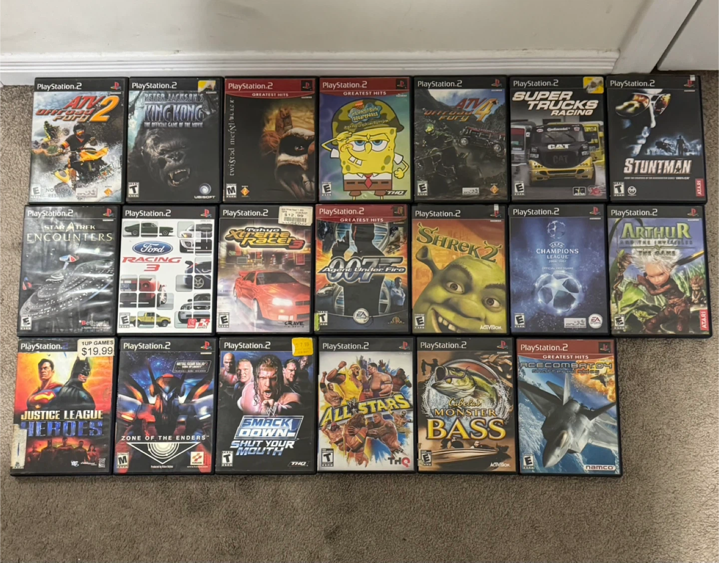 68Selling a bundle of PlayStation 2 games! All in good condition and ready for a new home. Titles include: - ATV Offroad Fury 2 - Peter Jackson's King Kong - Twisted Metal Black - Spongebob Squarepants Battle for Bikini Bottom - Super Trucks Racing - Stuntman - Star Trek Encounters - Ford Racing 3 - Tokyo Xtreme Racer 3 - James Bond 007 in Agent Under Fire - Shrek 2 - Arthur - Justice League Heroes - Zone of the Enders - WWE Smackdown! Shut Your Mouth - All-Stars - Cabela's Monster Bass - Ace Combat 04 - UEFA Champions League 2006-2007 - ATV Offroad Fury 4 Play station 2 games . There are 20 games in total . Take all for $ 60. Thanks.