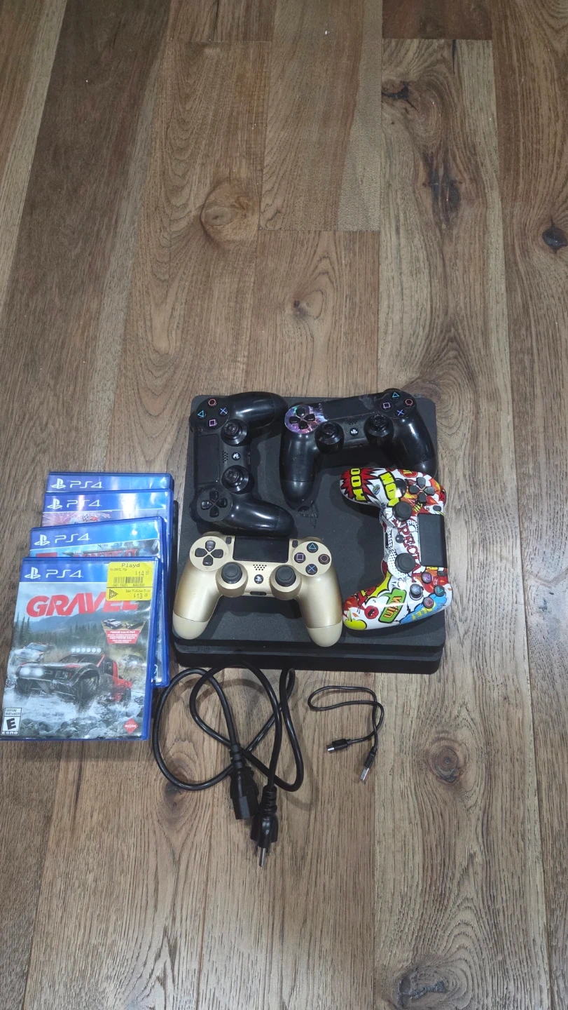 15Selling a good but used PlayStation 4 Slim. It comes with 4 games and 4 controllers with the cables (display cable not included) to get you started right away. Great for some fun times! No issues and works great, outside needs a little cleaning but the inside is good and not damaged.