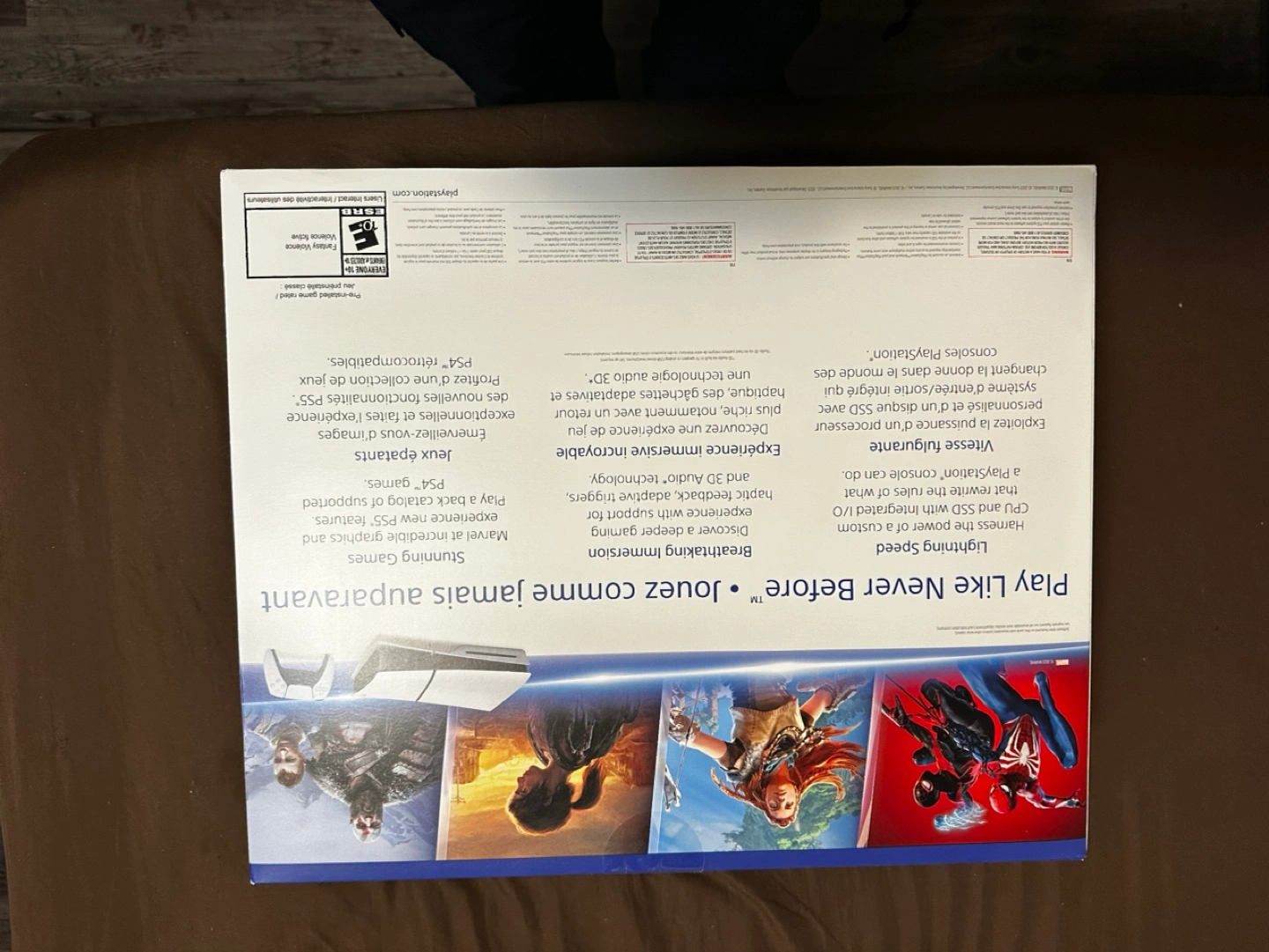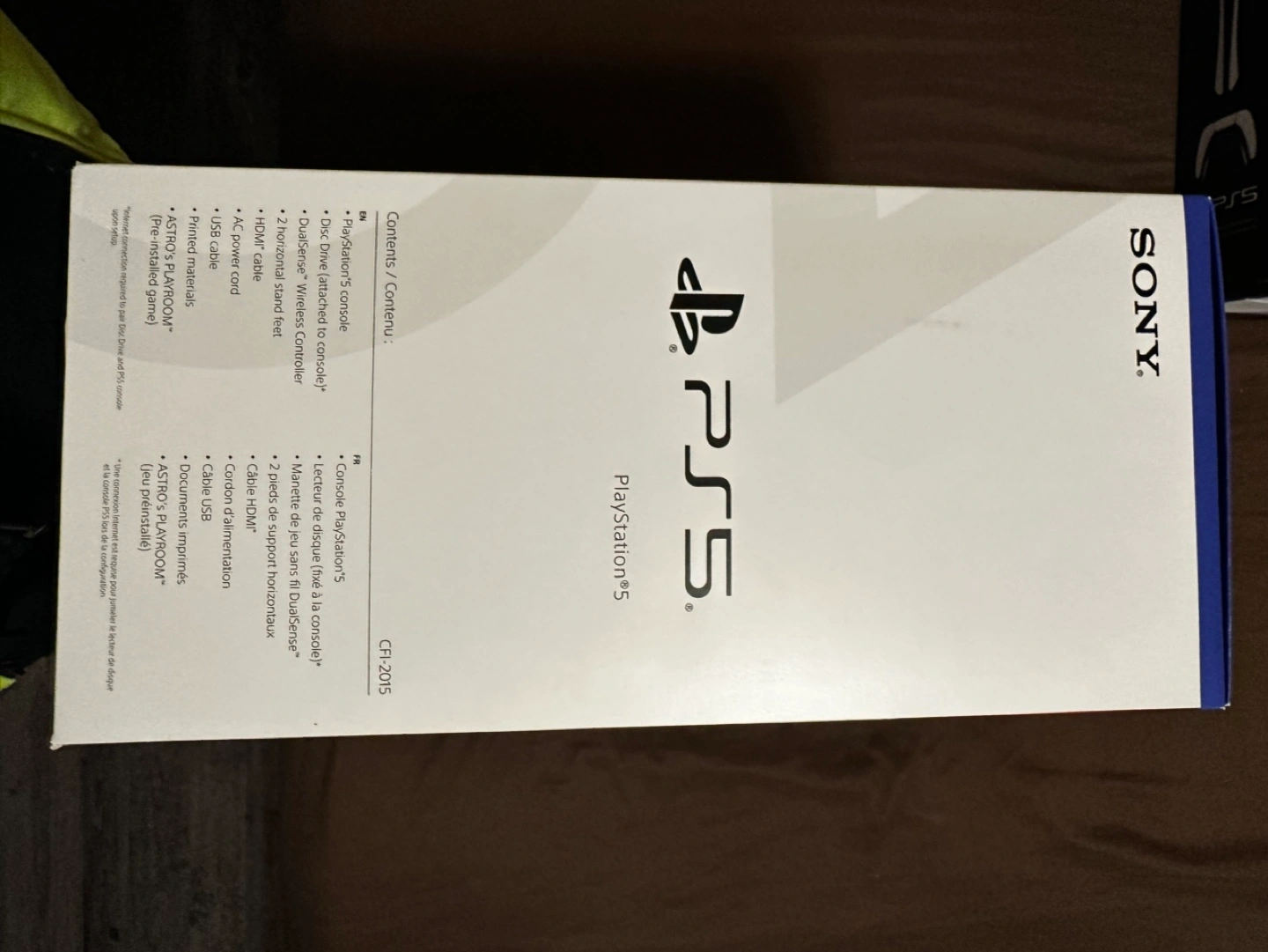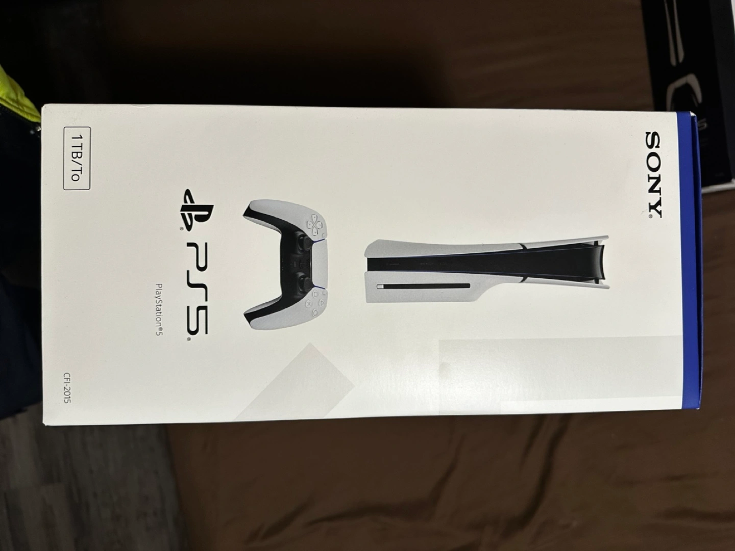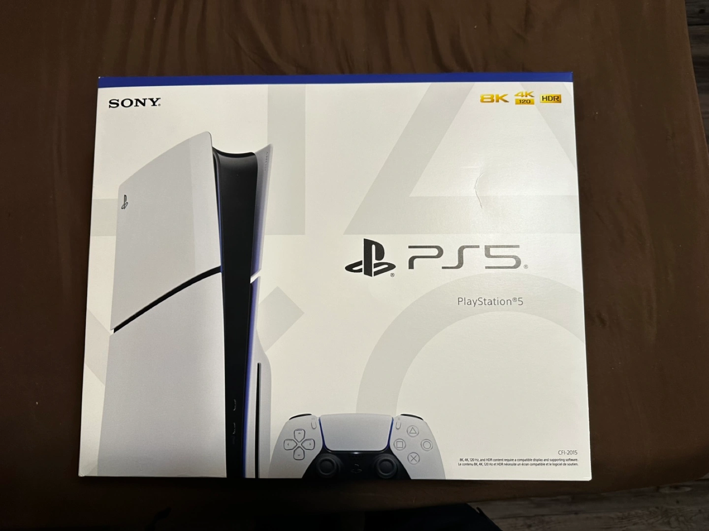 10PlayStation 5 console with 1TB of storage. Includes DualSense wireless controller, HDMI cable, USB cable, and power cord.