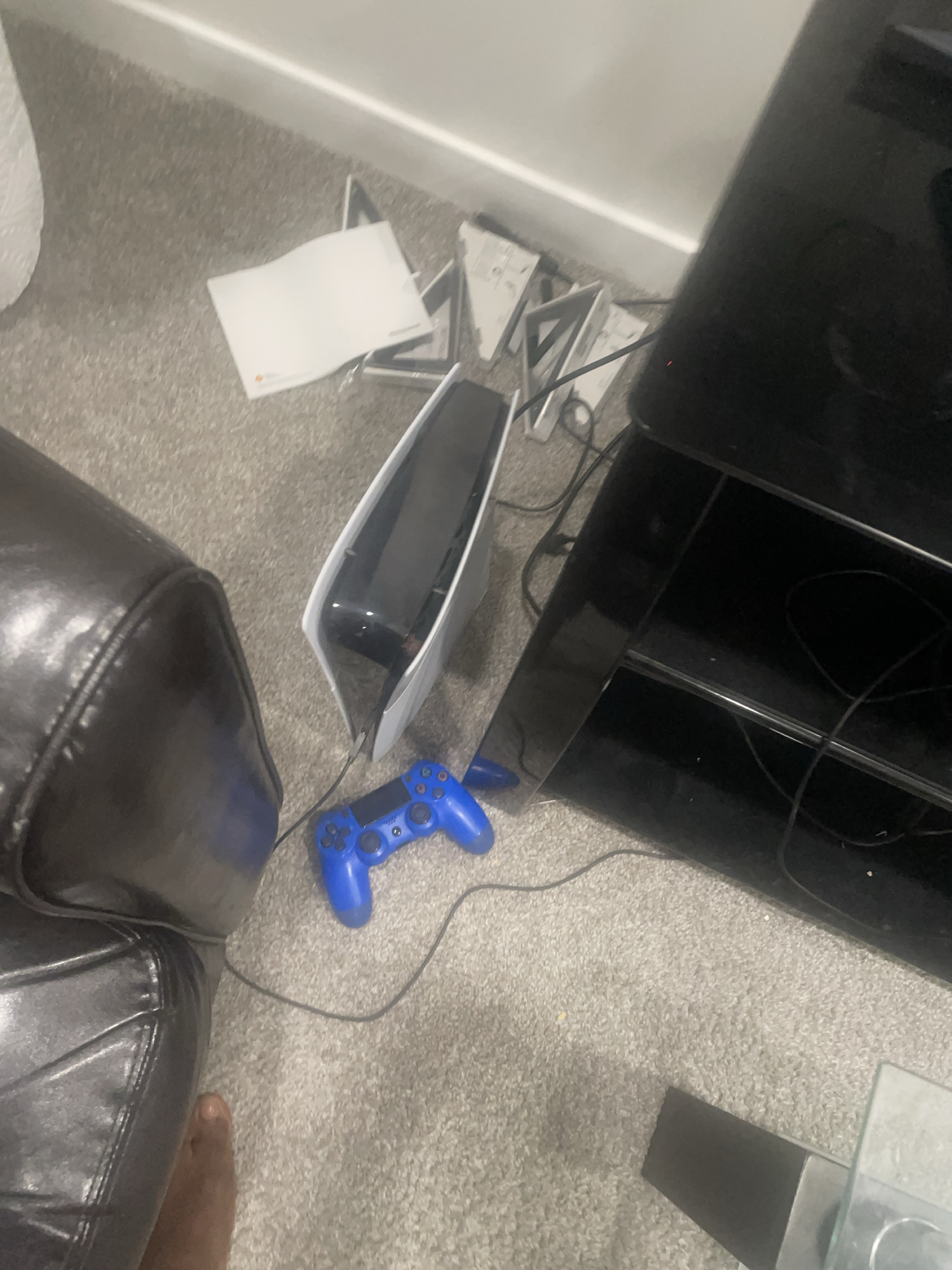 A PlayStation 5 console and controller. Comes with a controller and several accessories. Great for a cozy night of gaming.