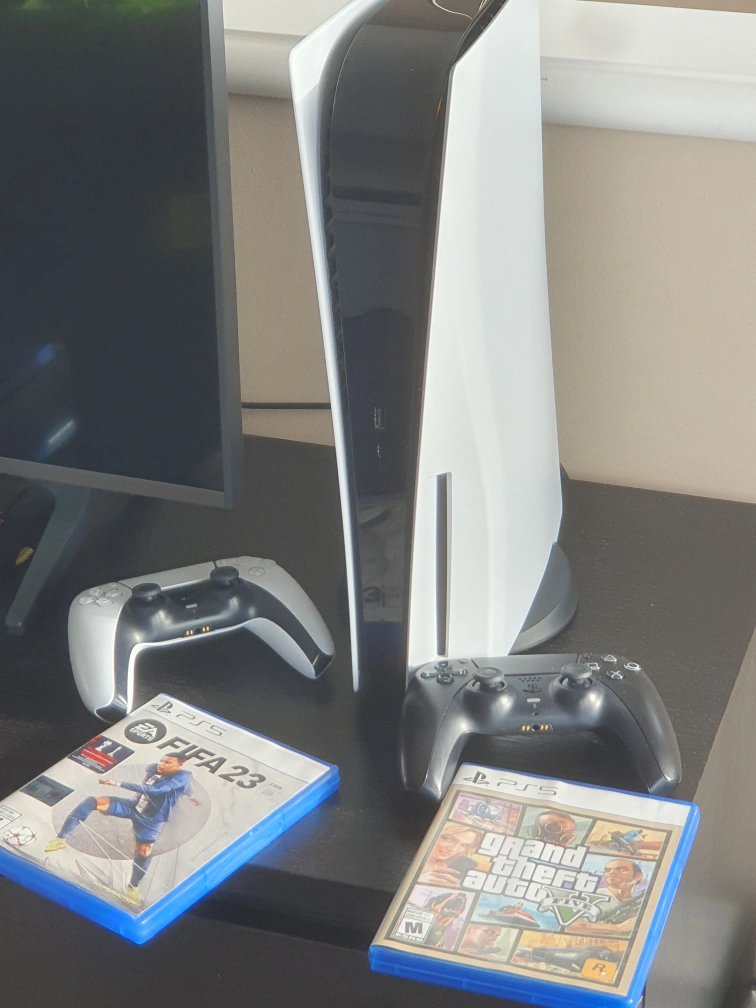 PlayStation 5 console, 2 controllers, FIFA 23 and Grand Theft Auto V with the Hdmi cable and the power cable .