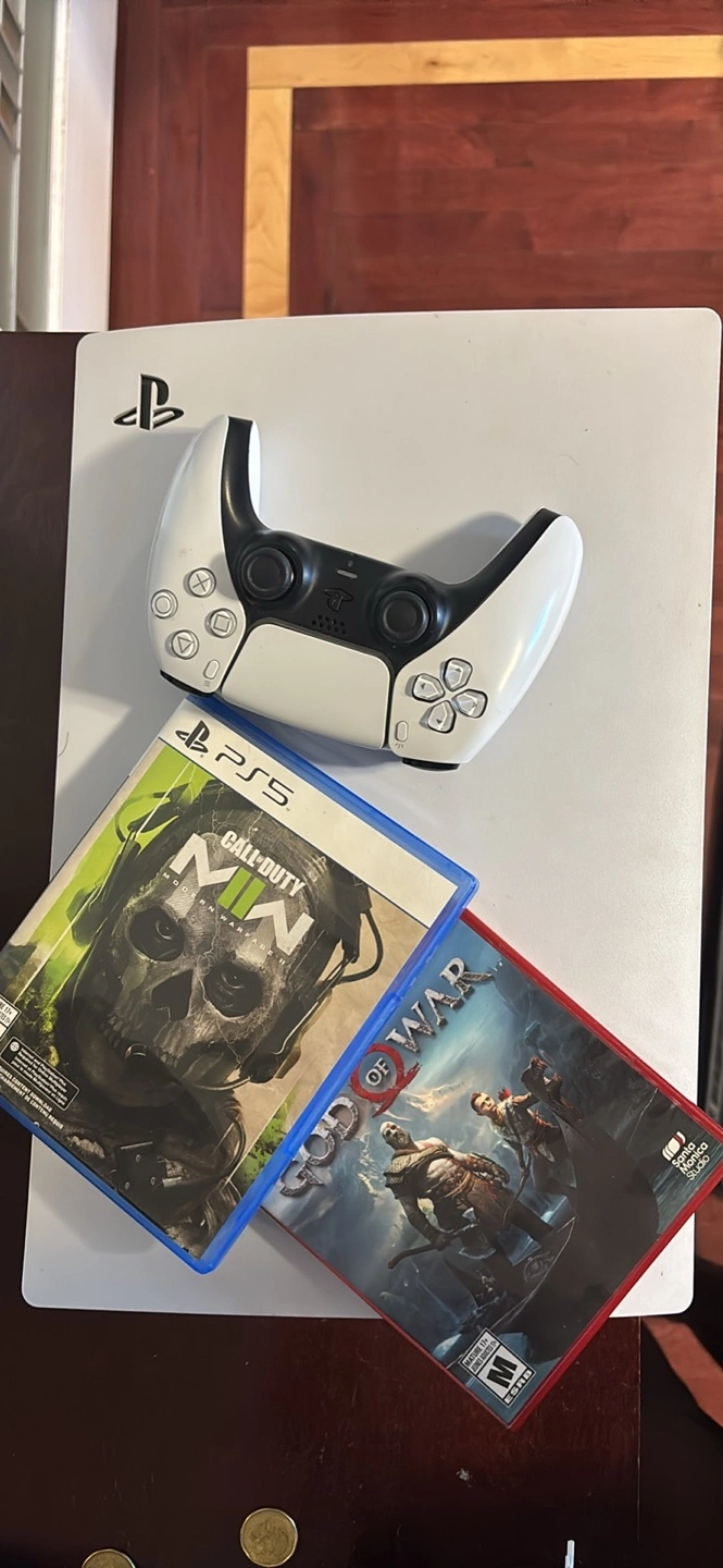 78Sony PlayStation 5 console. Includes one controller and cables. 2 disc games - Call of Duty - God of War Great condition. Firm price