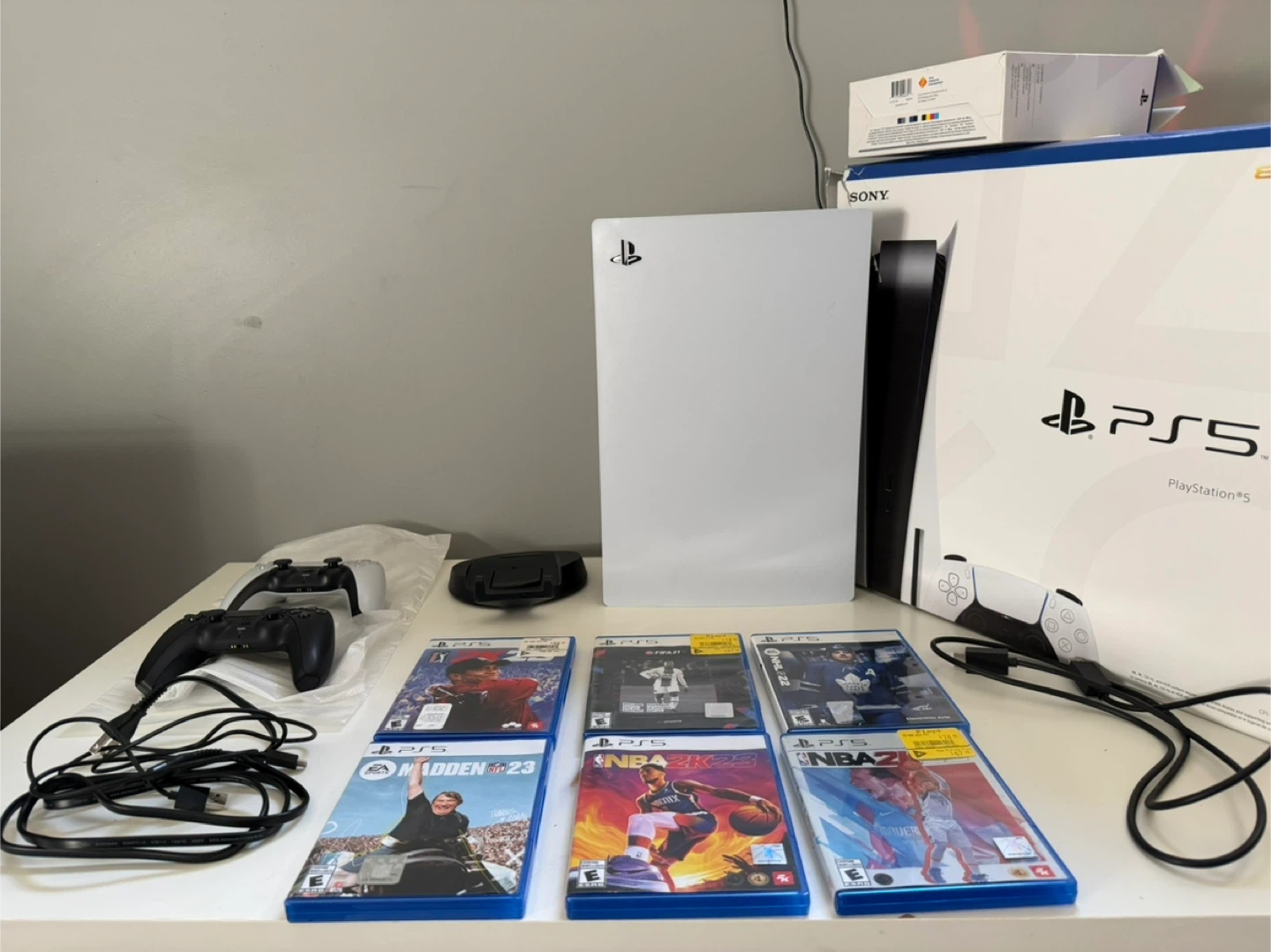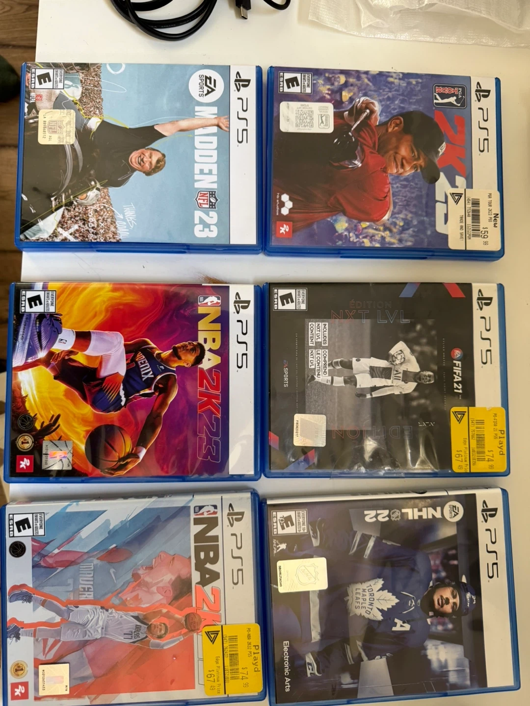 10Moving out sale: Selling my PlayStation 5 disc edition in excellent condition. Comes with: • 2 DualSense controllers (white + black) • Original box, stand, power/HDMI/USB cables • 6 games: Madden 23, PGA Tour 2K23, NBA 2K23, FIFA 21, NBA 2K21, NHL 22 Everything works perfectly and has been well cared for. Great value if you want a full setup ready to play. Comes with Boxes. Rarely played still have new purchase smell.