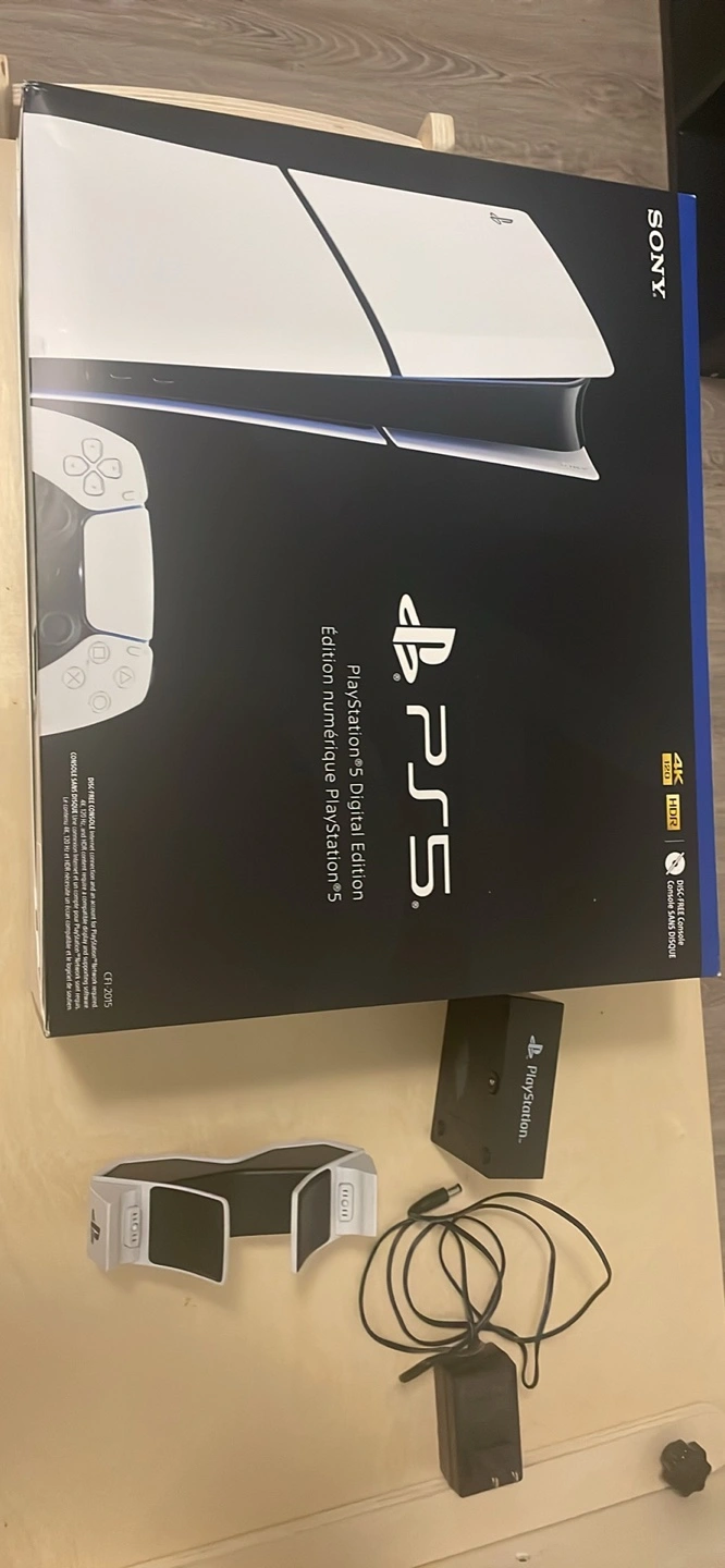 18PlayStation 5 Digital Edition console, white. Includes console, controller, charging station and memory port.
