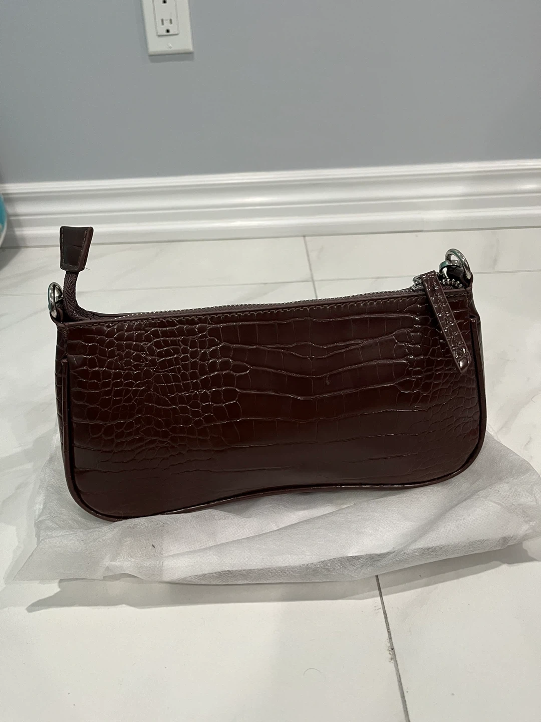 A cute brown baguette bag with a crocodile print pattern! It's perfect for carrying your essentials and adding a touch of style to any outfit