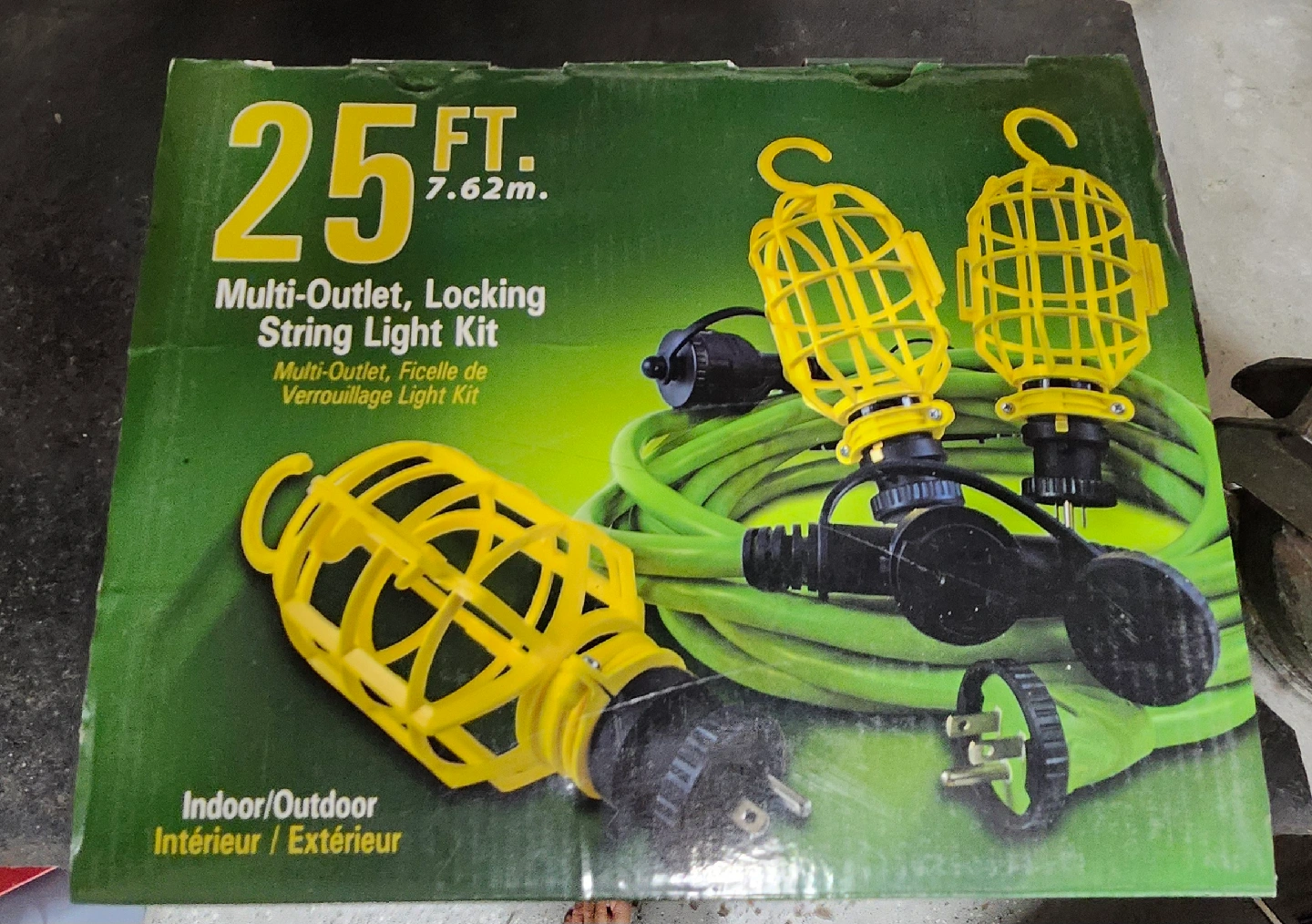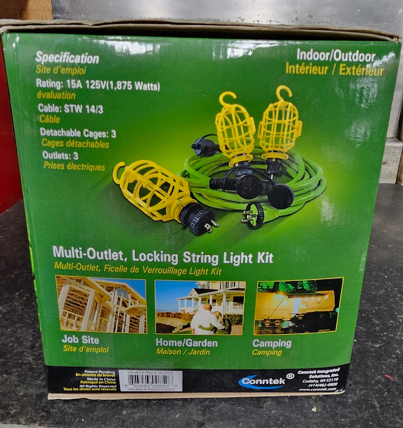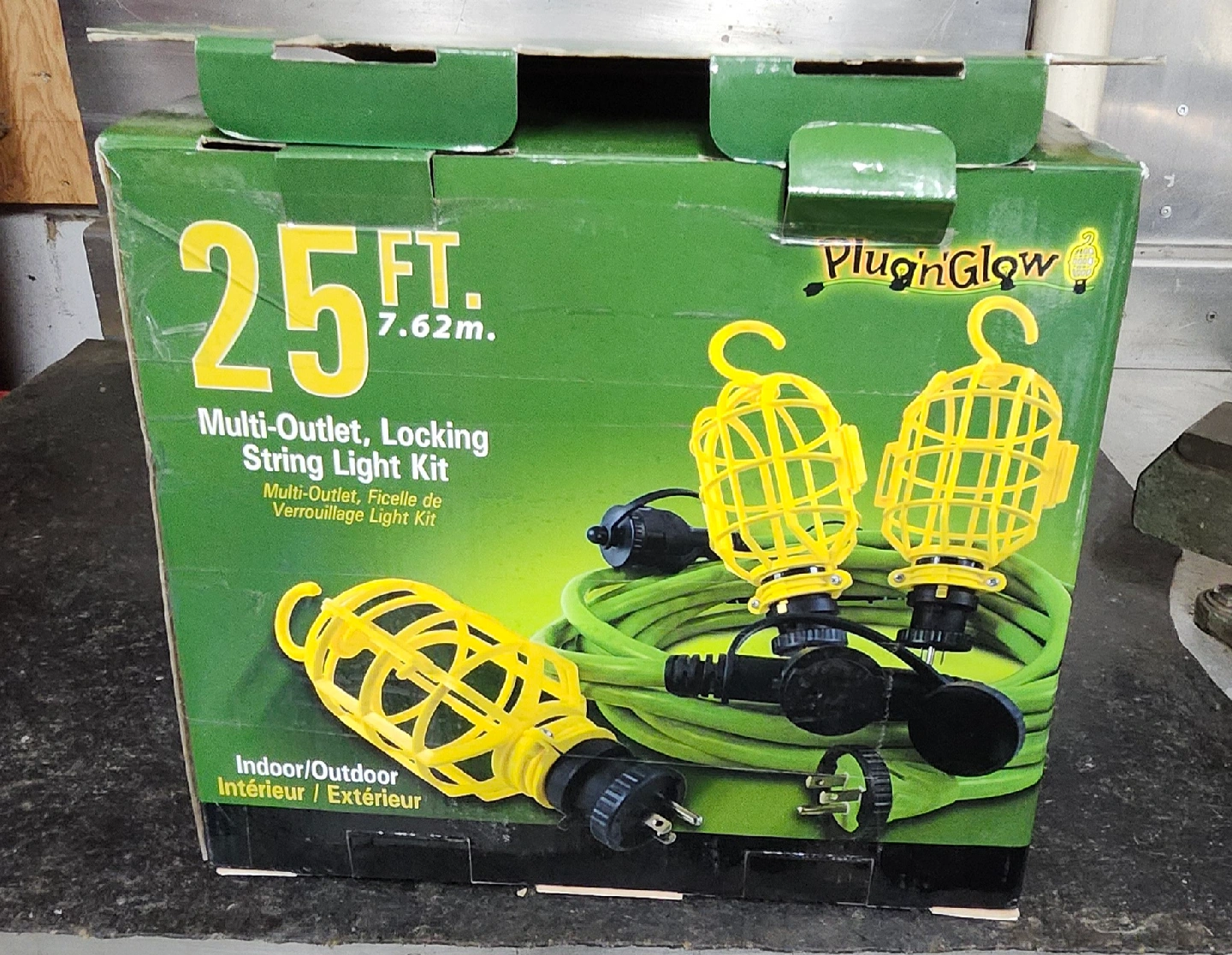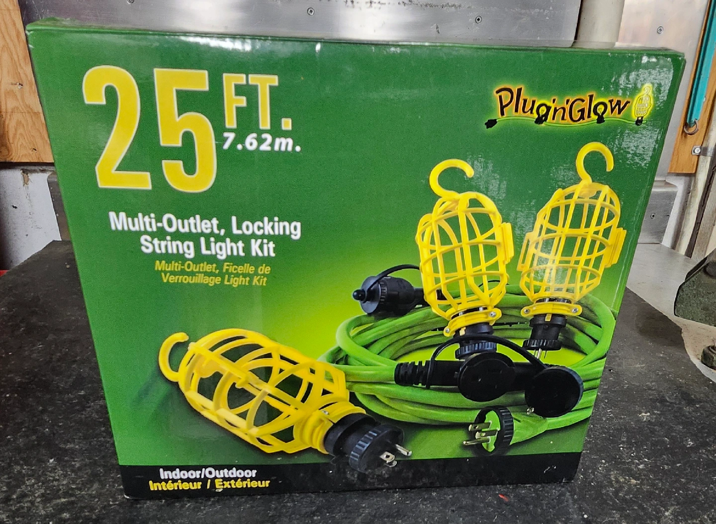 Selling a PluginGlow 25 FT Multi-Outlet Locking String Light Kit. - 25 FT (7.62m) - Multi-Outlet, Locking String Light Kit - Detachable Cages: 3 - Outlets: 3 - Indoor/Outdoor Rating: 15A 125V(1,875 Watts)
