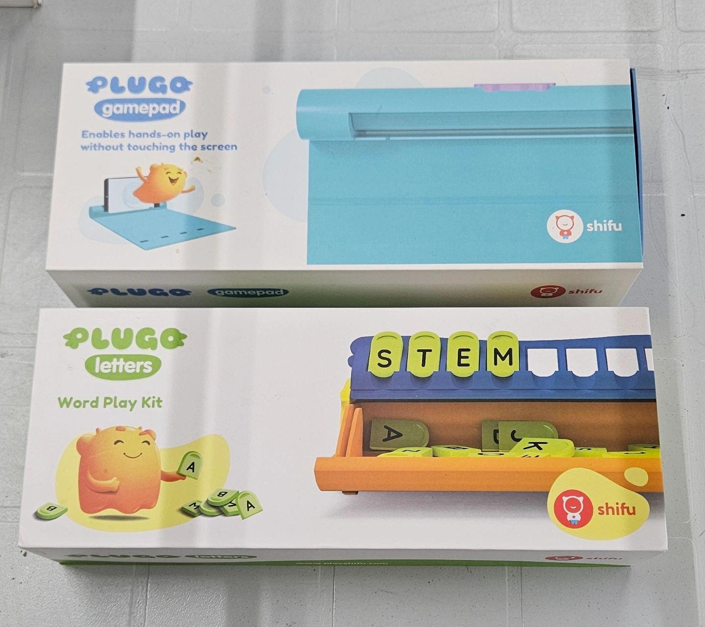 23Two Plugo kits. Gamepad enables hands-on play without touching the screen. Letters kit is a word play kit.