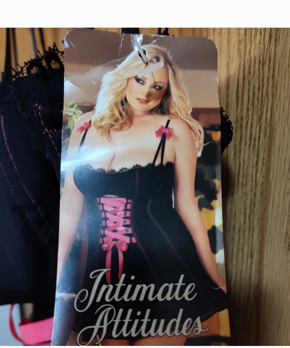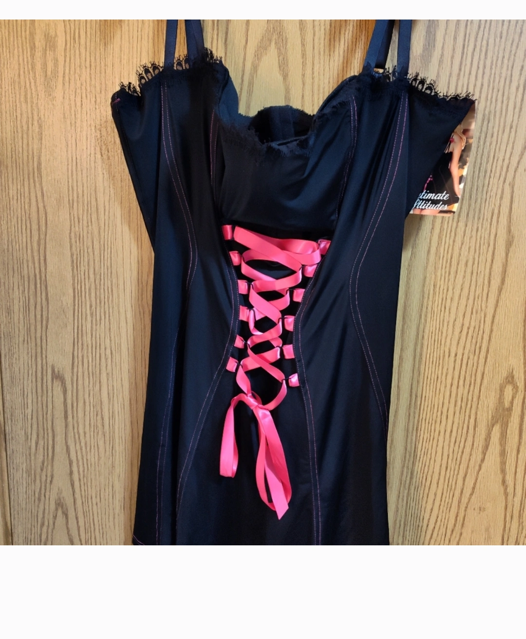 Plus size 3X chemise,flair cut,lace up front, corset style,lingerie has adjustable straps with pink bows on the front, contrast stitching, and a lace bra with full support. The bra top includes scalloped lace along the bustline. By Shirley of Hollywood. NS, small dog home. PU 216th & Lougheed Hwy or Langley Centre on Thursday 930-1230.