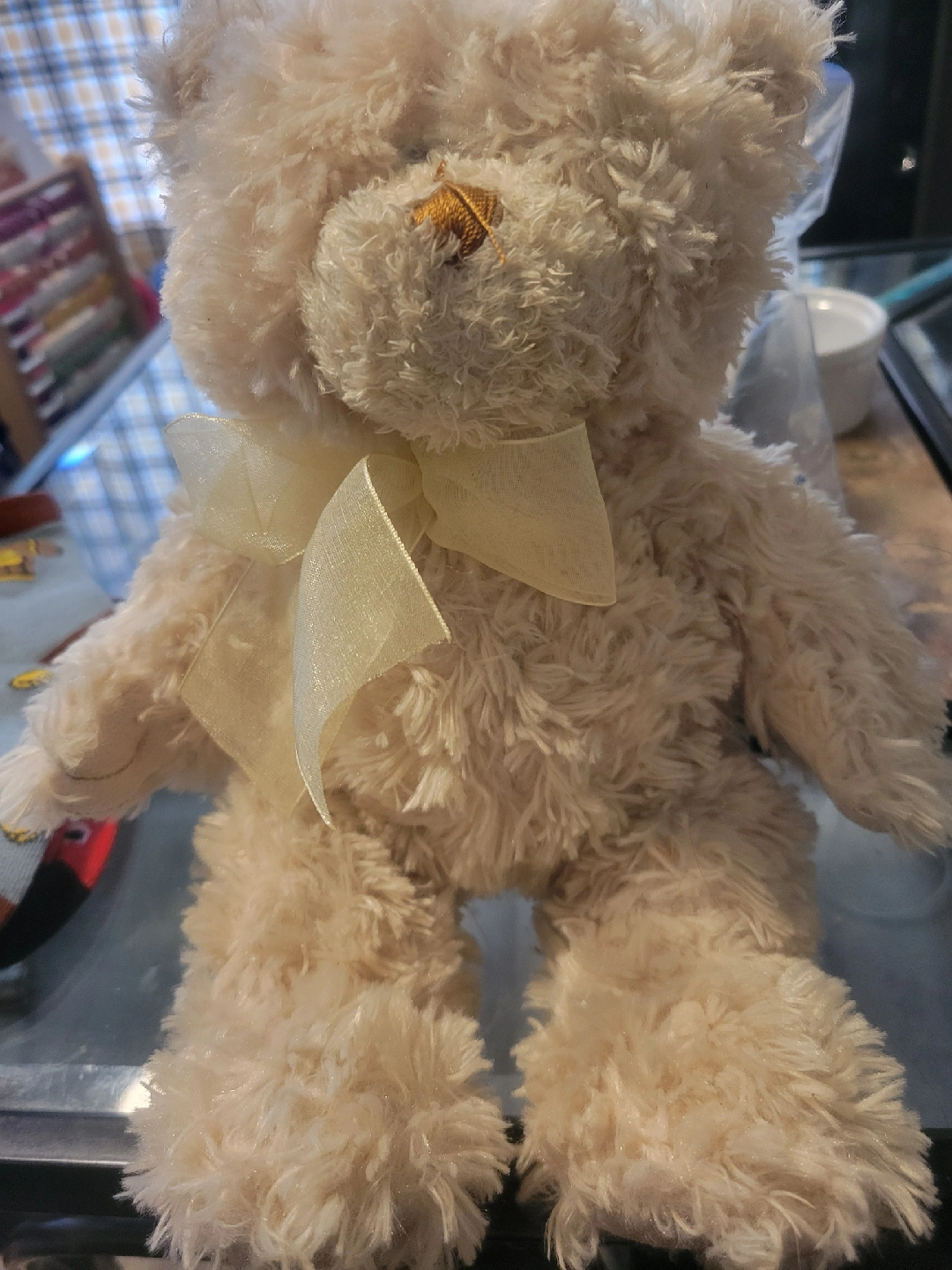 A super cute and cuddly cream-coloured teddy bear! It's in great shape and features a sweet ribbon around its neck. Perfect for snuggling or as a charming addition to any room