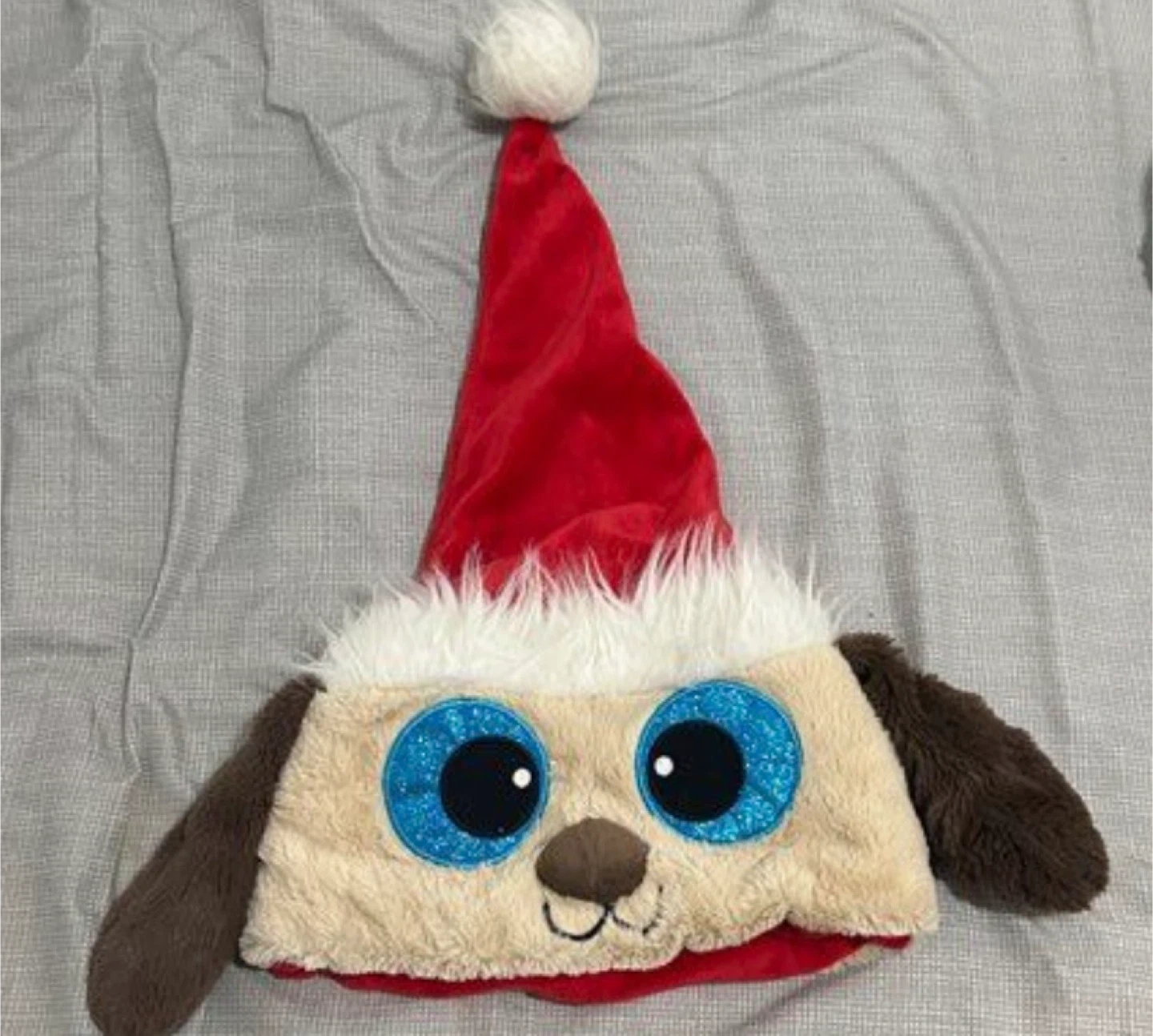 60Super cute plush dog Santa hat! Perfect for the holidays and keeping cozy. It's in great condition and ready for a new home