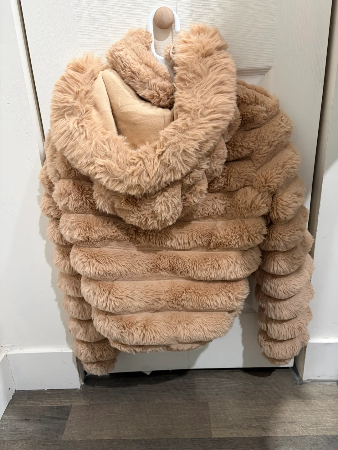 10Plush jacket in a beige color! It’s super soft and cozy, perfect for chilly days. The jacket has a hood and a zip-up front. The removable hood lets you change your look easily — wear it for extra warmth or take it off for a more casual style. Comfortable, versatile, and easy to pair with any winter outfit.