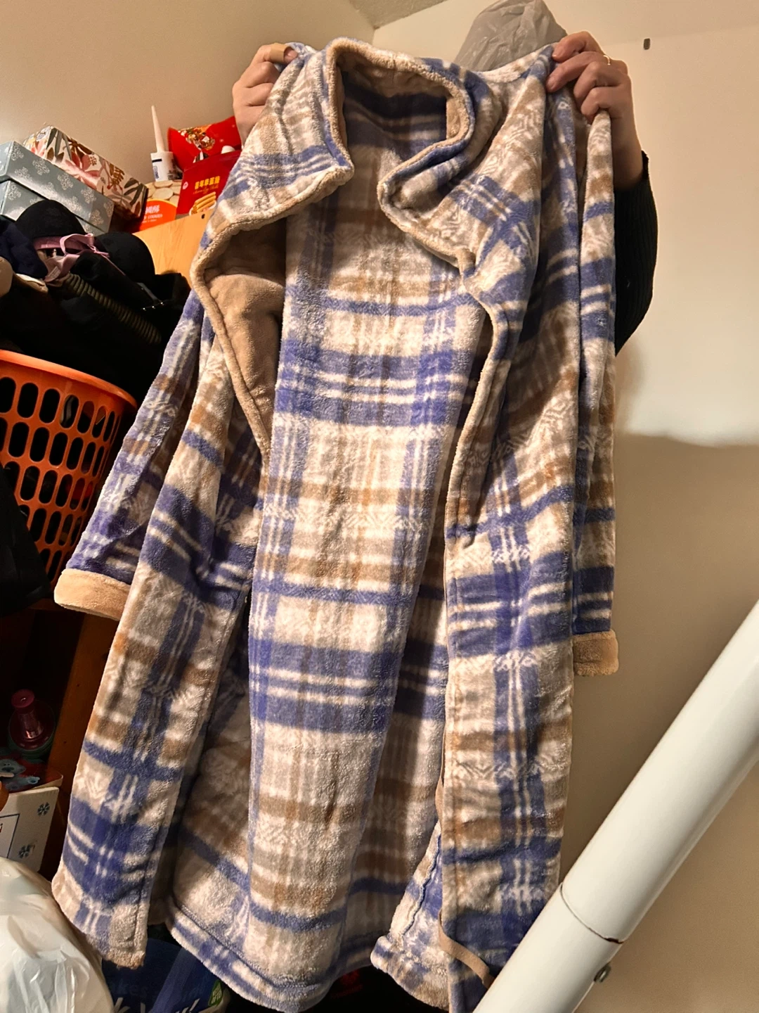 154Selling a super cozy plush bathrobe! It's a lovely plaid pattern in shades of blue, brown, and cream. Perfect for staying warm on chilly mornings or evenings L size