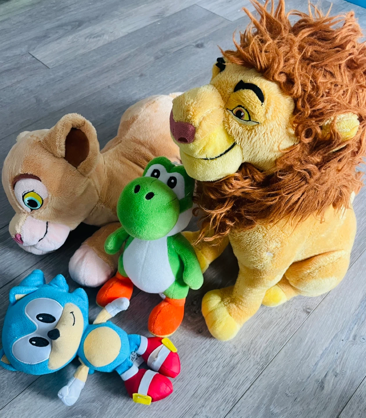 Plush Toys: Lion King, Yoshi, and Sonic