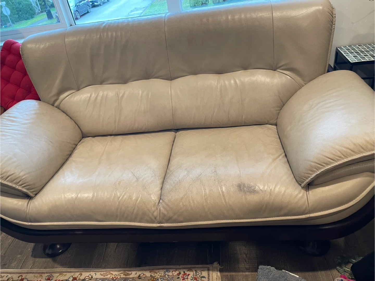 Two peace cream leather sofa with a dark wood trim. Shows signs of wear, including discolouration and minor cracking on the seat cushions. It's a comfortable two-seater.