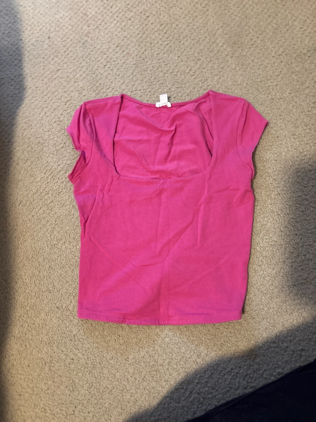 A bright pink cap sleeve top with a wide neckline. It's made of a stretchy, comfortable fabric. This top is great for layering or wearing on its own.