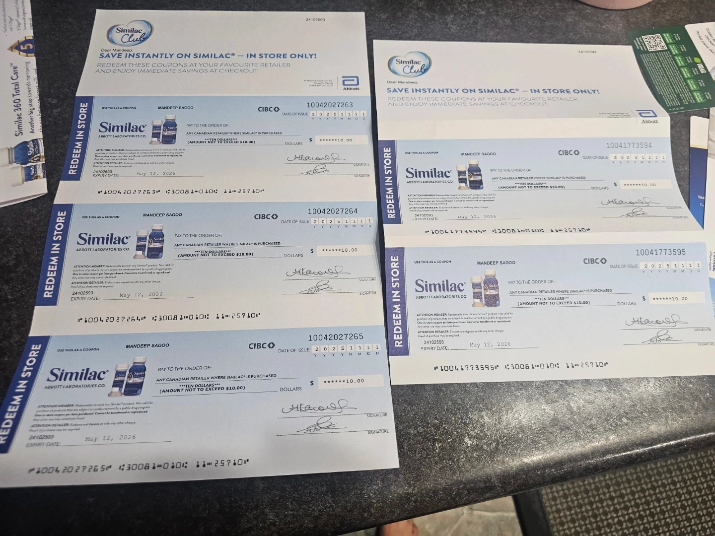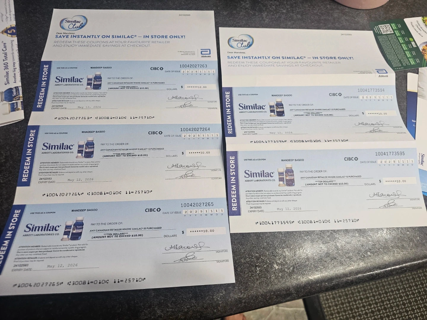 These are four Similac coupons, each offering $10 off. They expire on May 12, 2026. These coupons are for any Canadian retailer where Similac is purchased.total 50 dollers