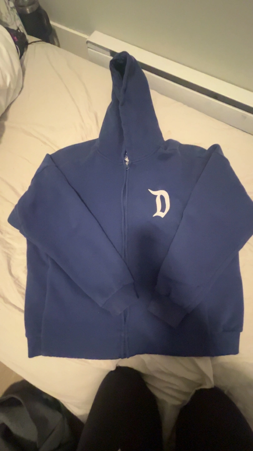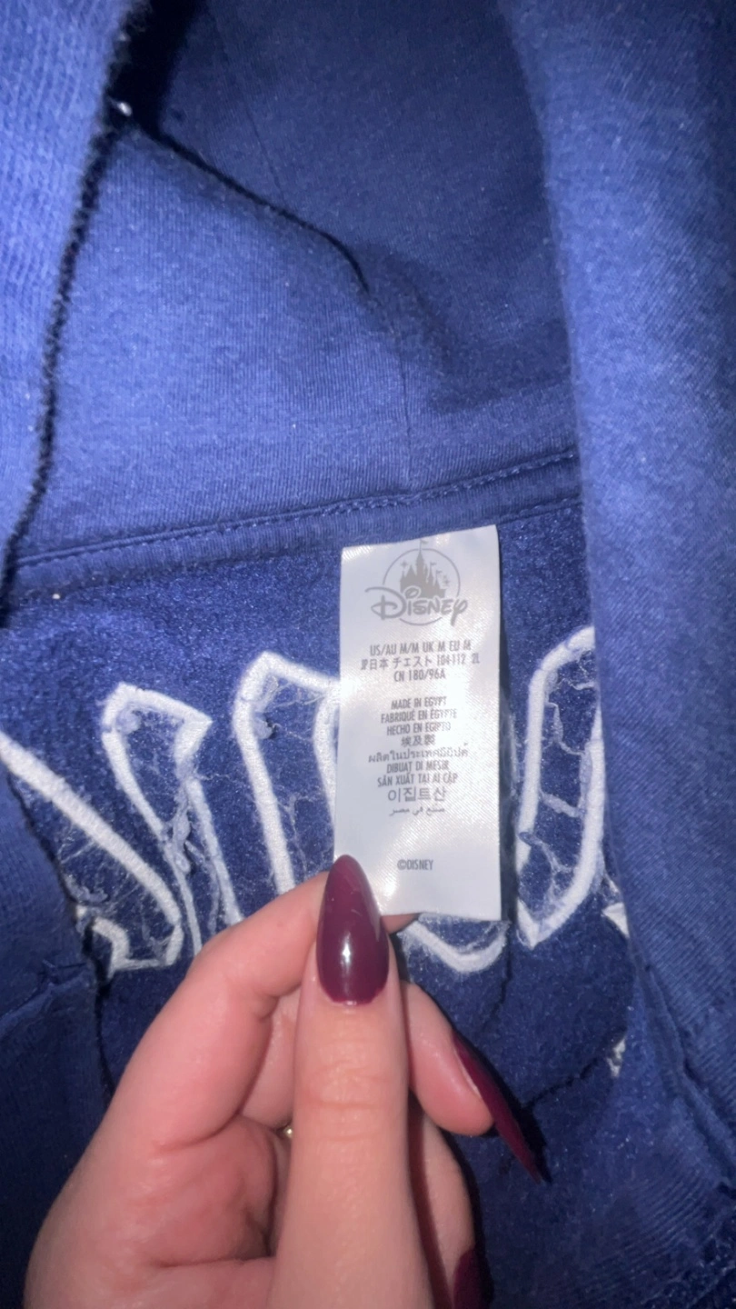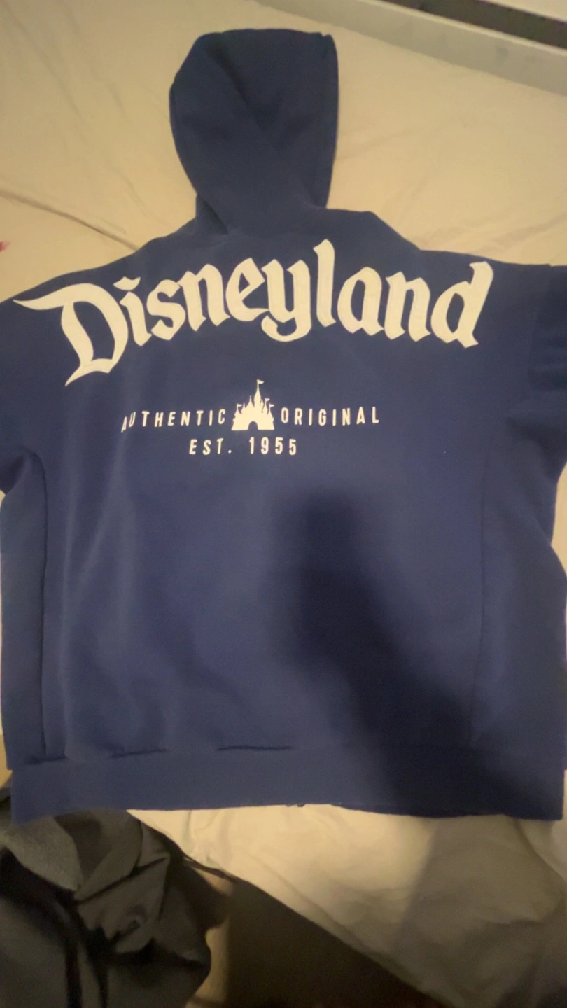 Blue Disneyland zip-up hoodie. Features a large 'D' on the front and 'Disneyland' across the back. Authentic Original Est. 1955. Made in Egypt.