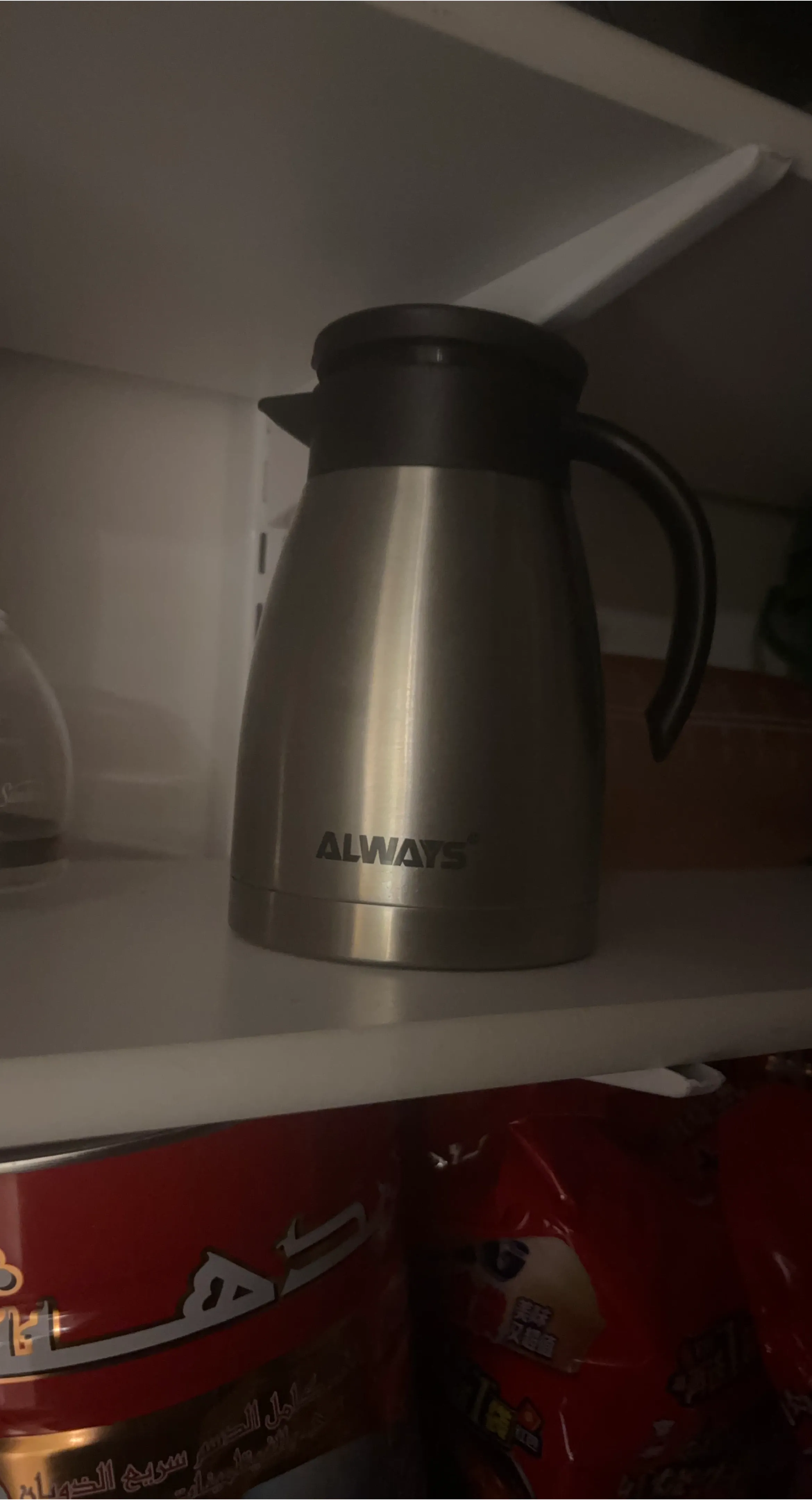 This is an Always brand thermal carafe with a stainless steel exterior. It's perfect for keeping beverages hot or cold. The carafe features a sturdy handle and a secure lid.