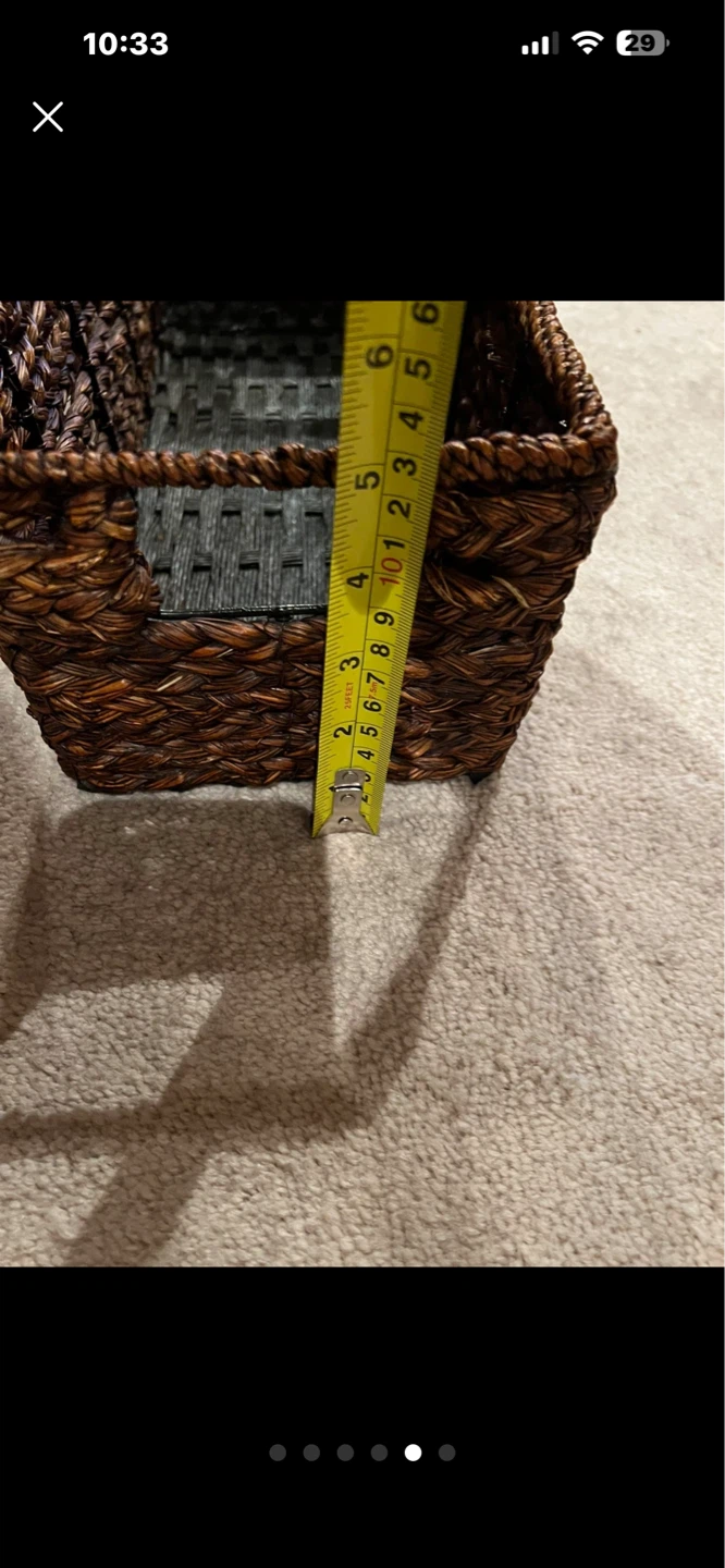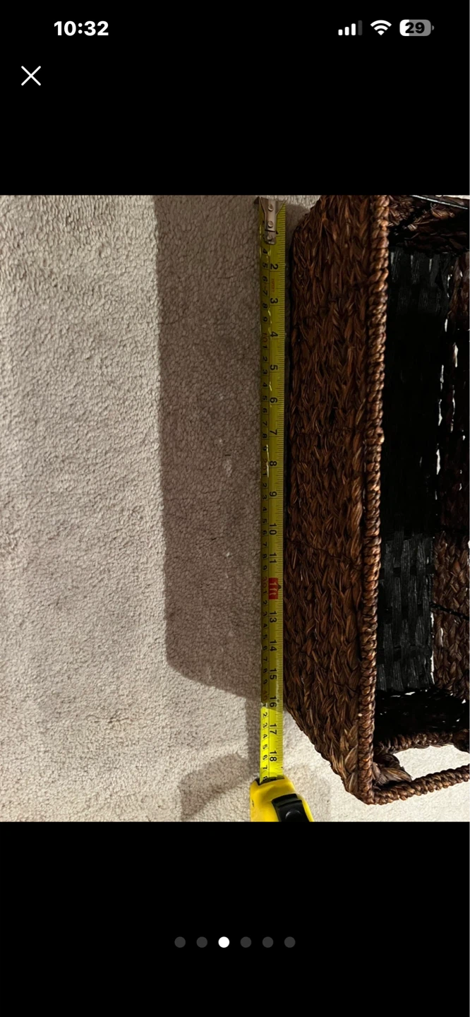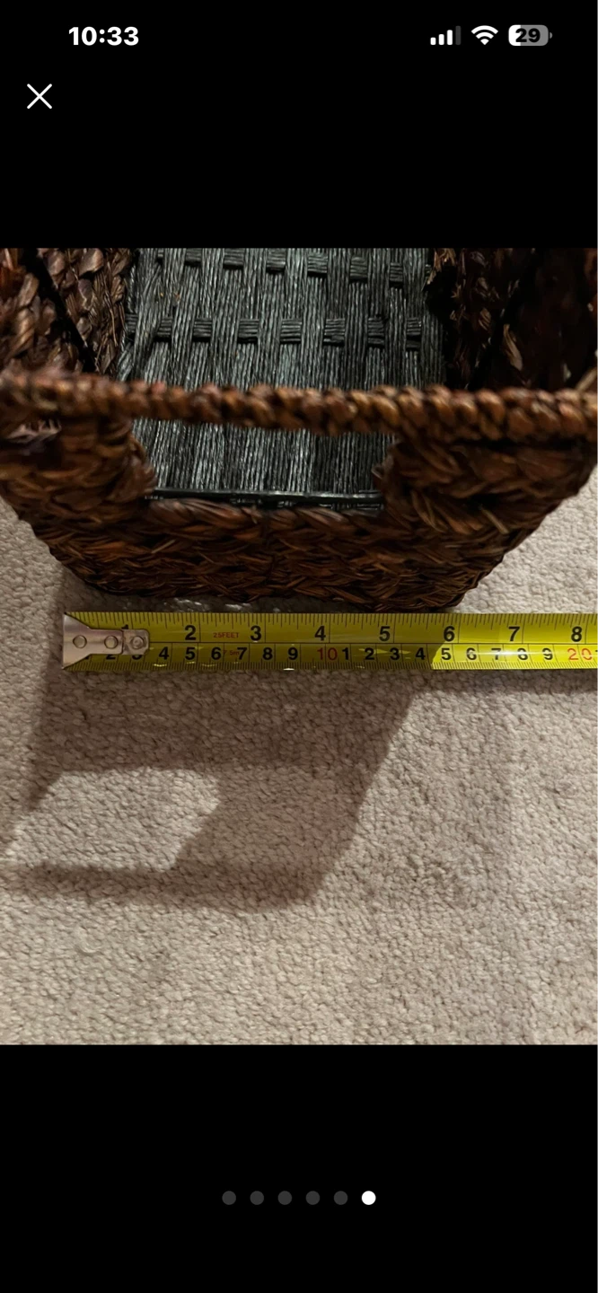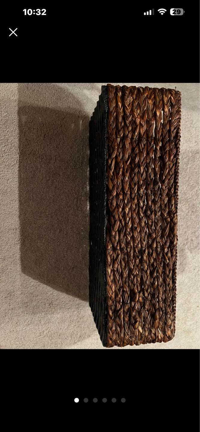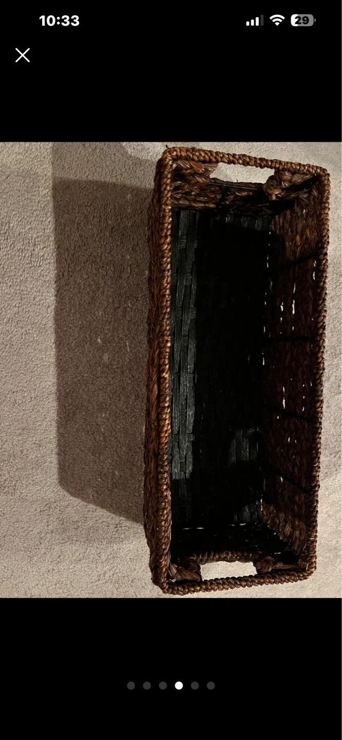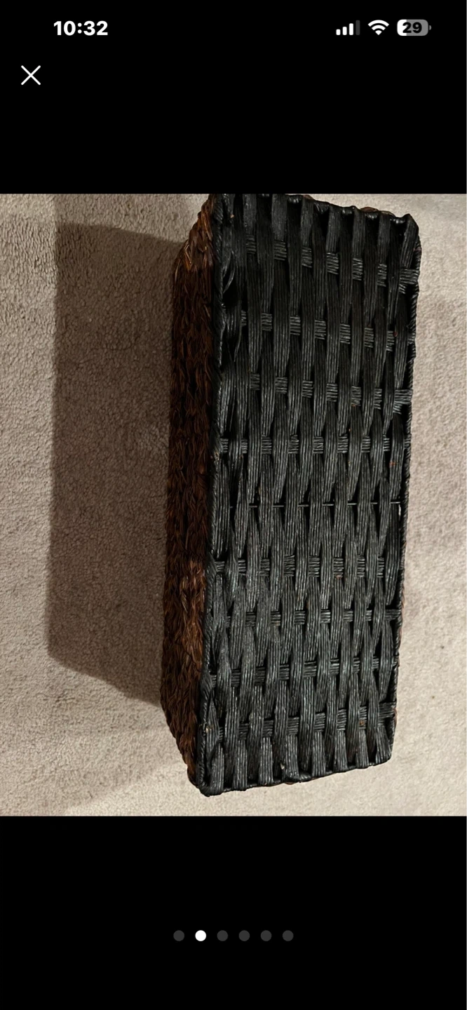 This is a dark brown woven basket with black lining. It measures approximately 18 inches long, 7 inches wide, and 6 inches high. Great for storage or display!