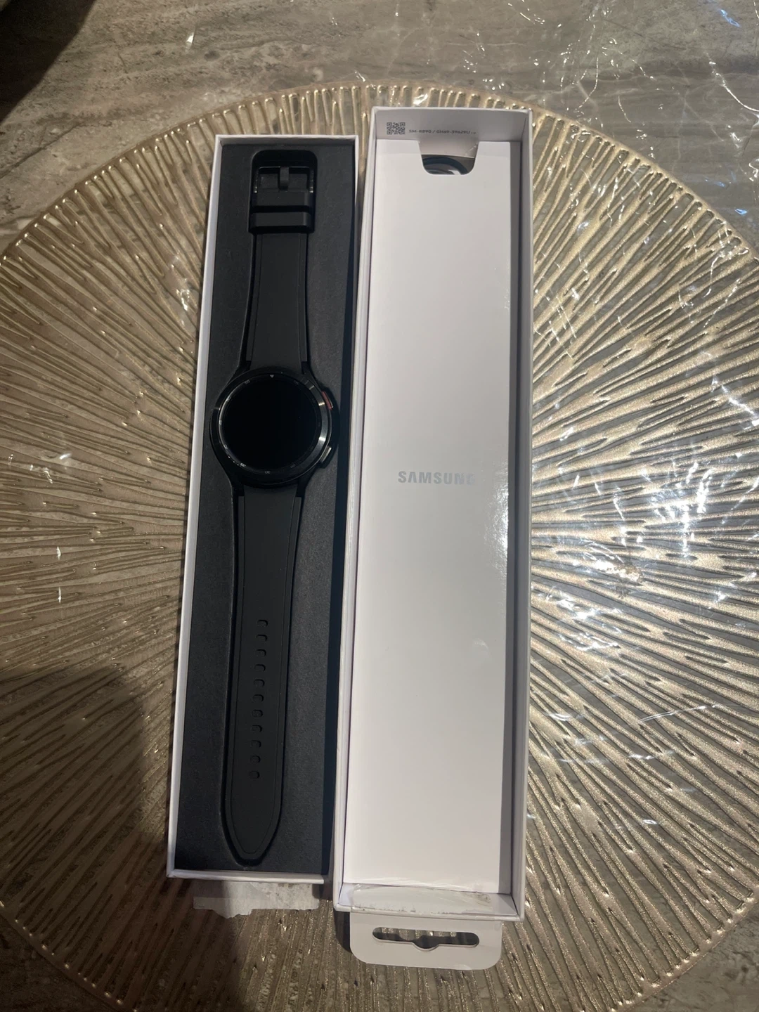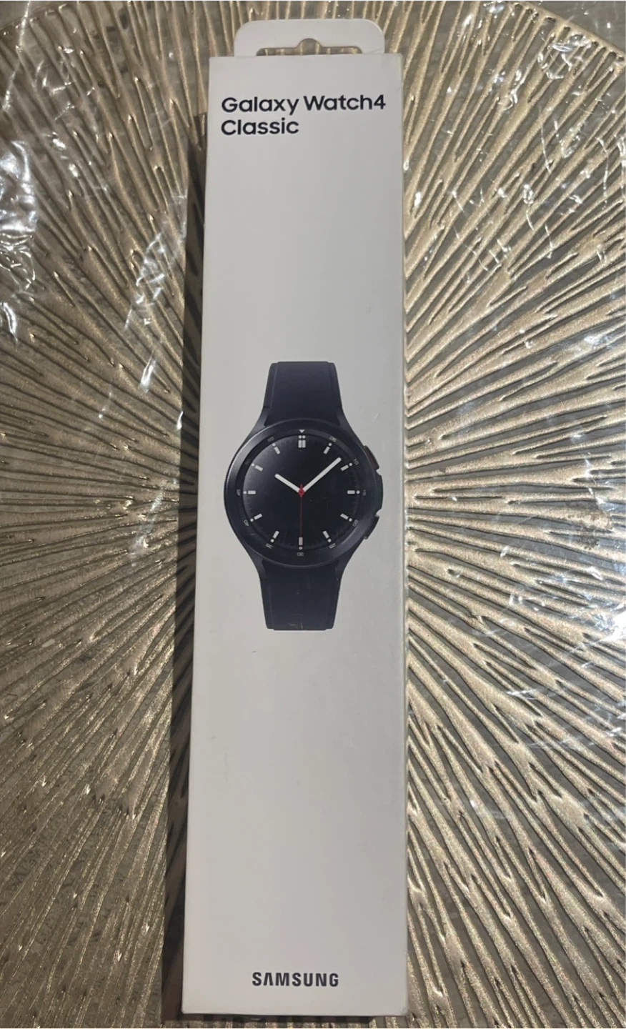 Samsung Galaxy Watch4 Classic smartwatch in black. Includes charging puck and original box. Comes with a black silicone band and an extra grey silicone band.