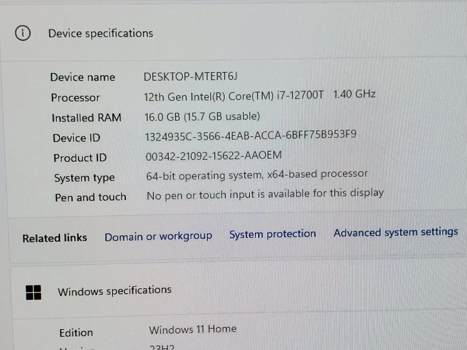 - Intel Core i7-12700T CPU (12th gen, 1.40 GHz, 12-cores)