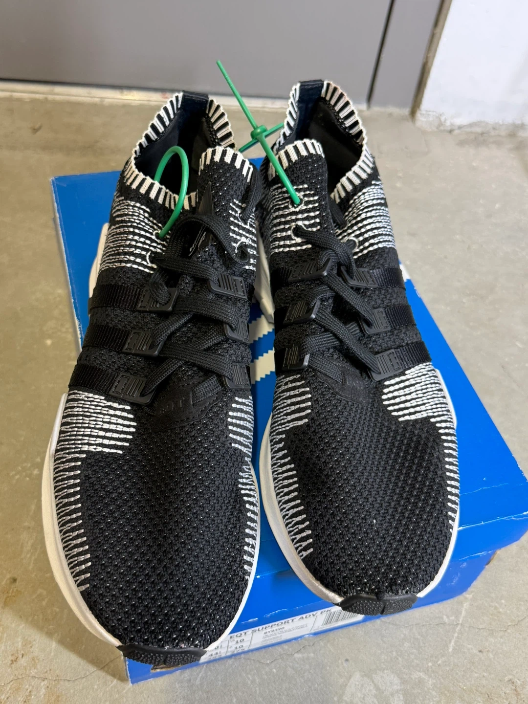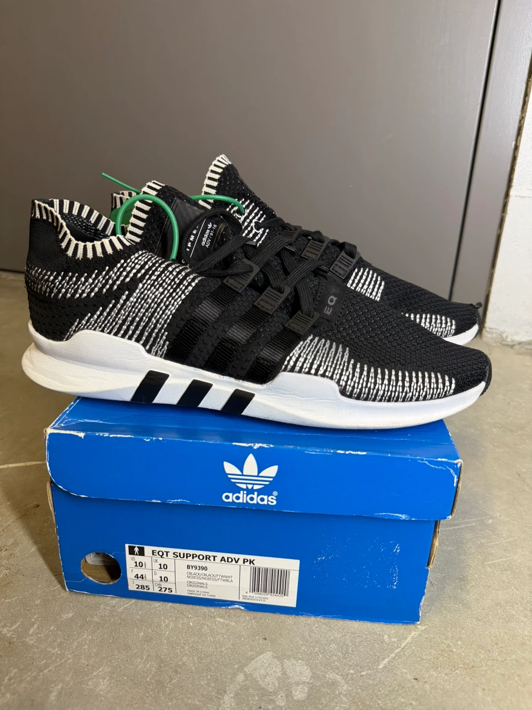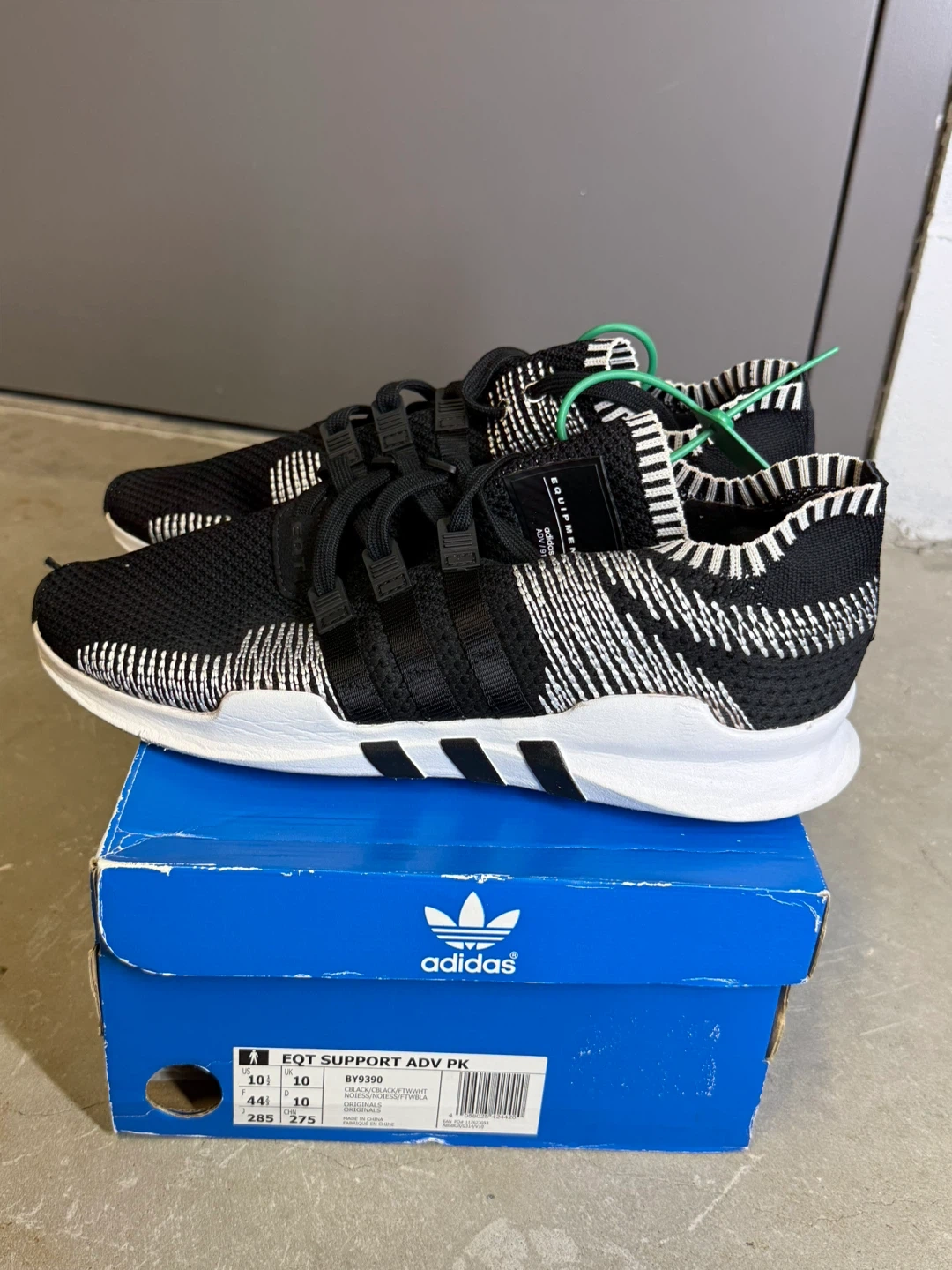 Black and white Adidas EQT Support ADV PK running shoes. Includes original box. Size is US 10.5