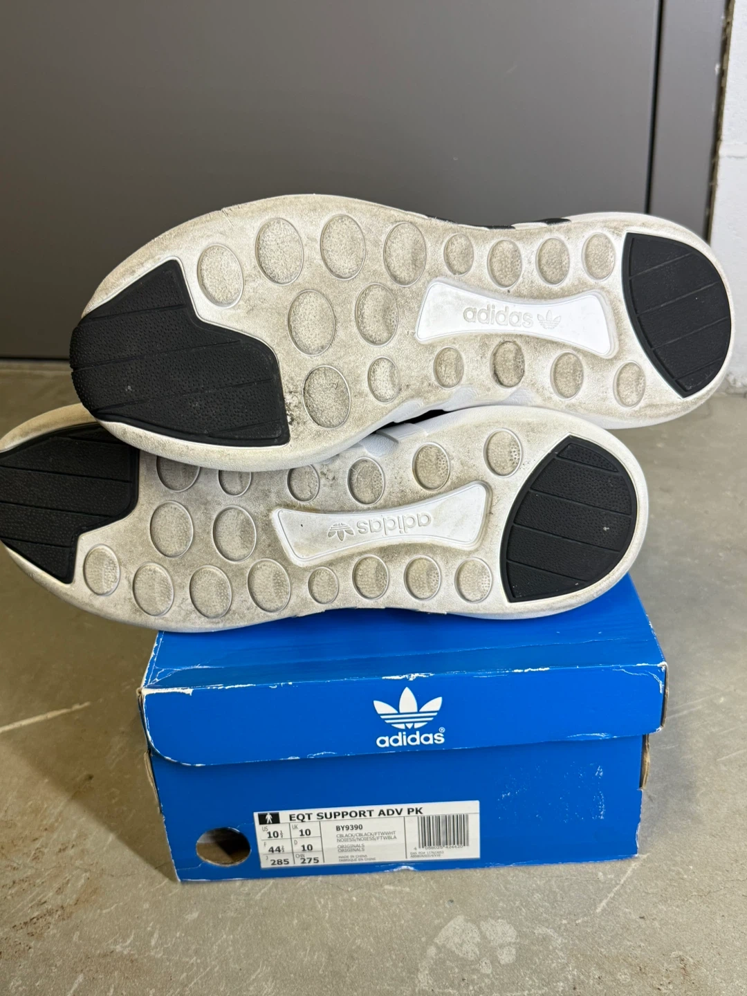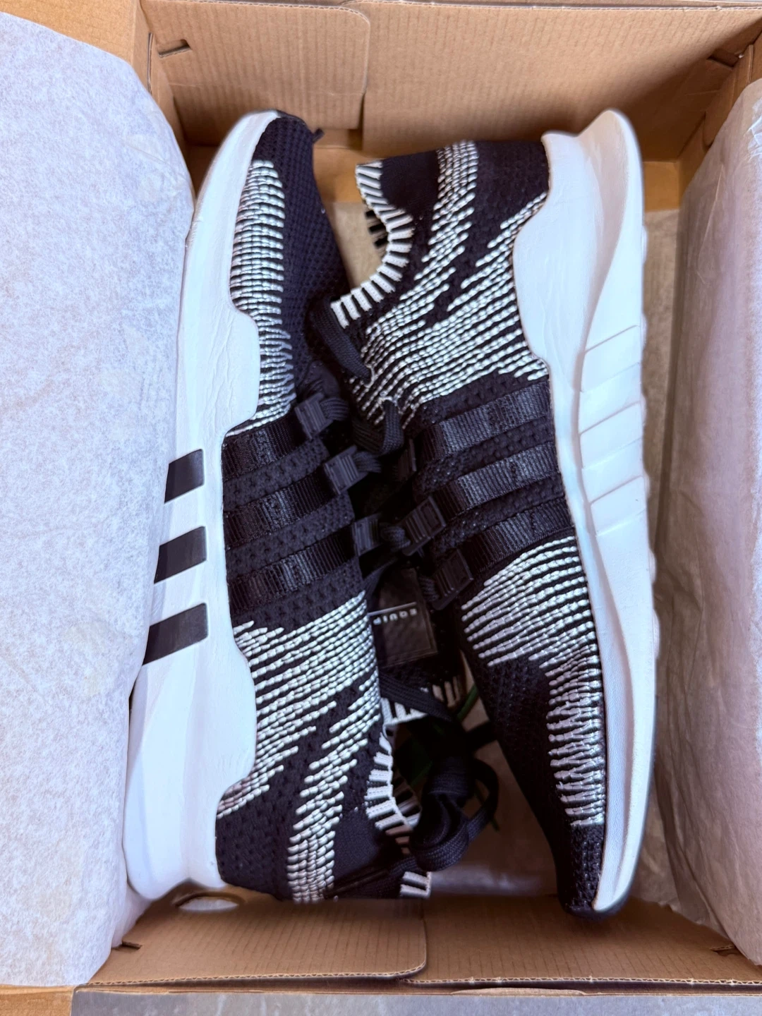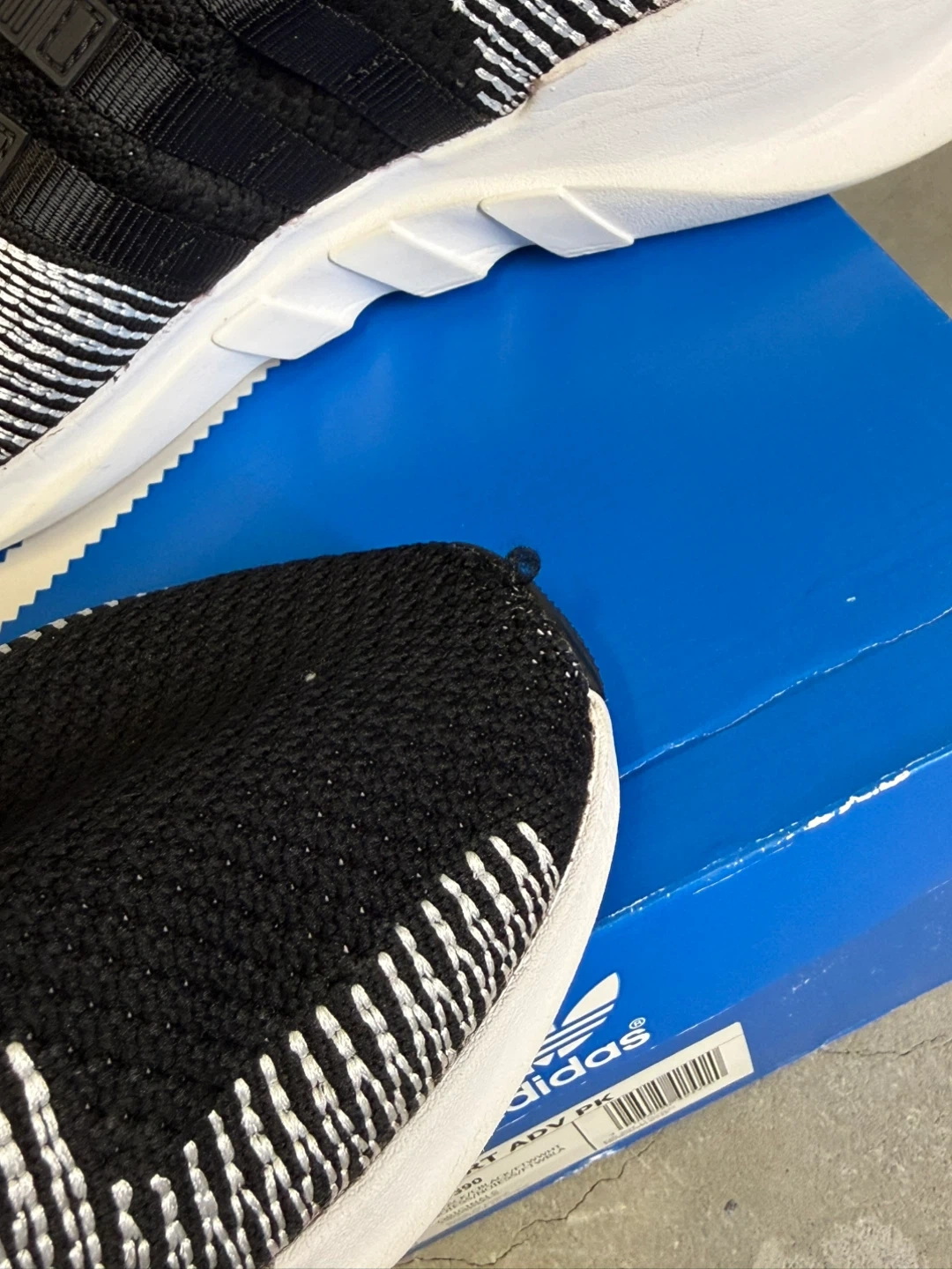 Black and white Adidas EQT Support ADV PK running shoes. Includes original box. Size is US 10.5