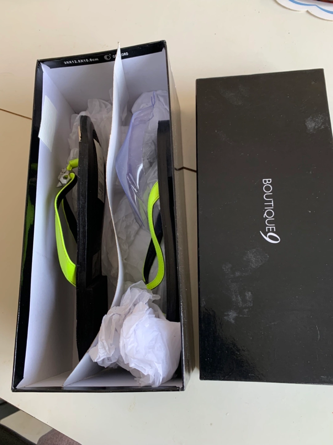 Brand new Boutique 9 flip flops. Black with neon yellow straps. Never worn. Comes in original box. Brought it for $75 plus tax