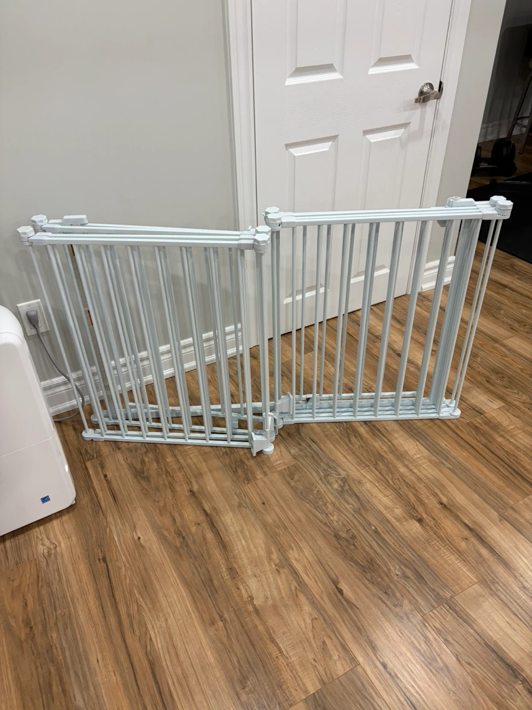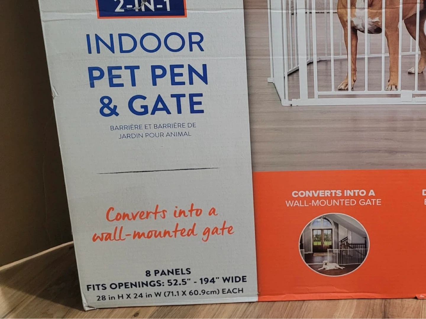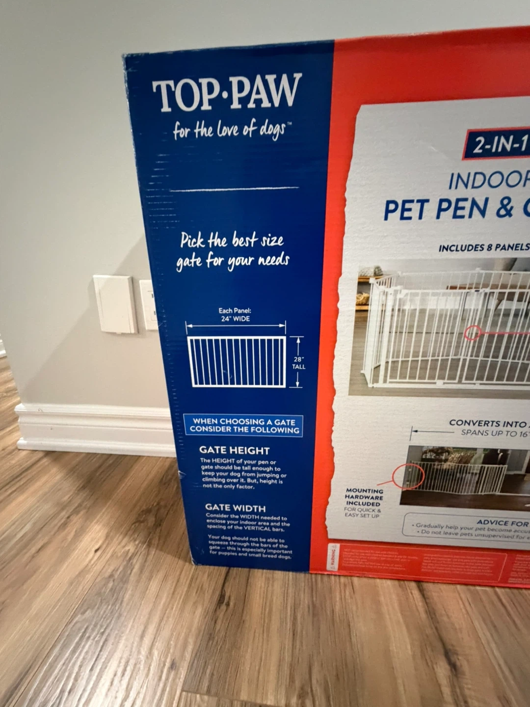 This is a 2-in-1 indoor pet pen and gate that includes 8 panels. Each panel is 24" wide and 24" tall. It converts into a wall-mounted gate and spans up to 16 ft.