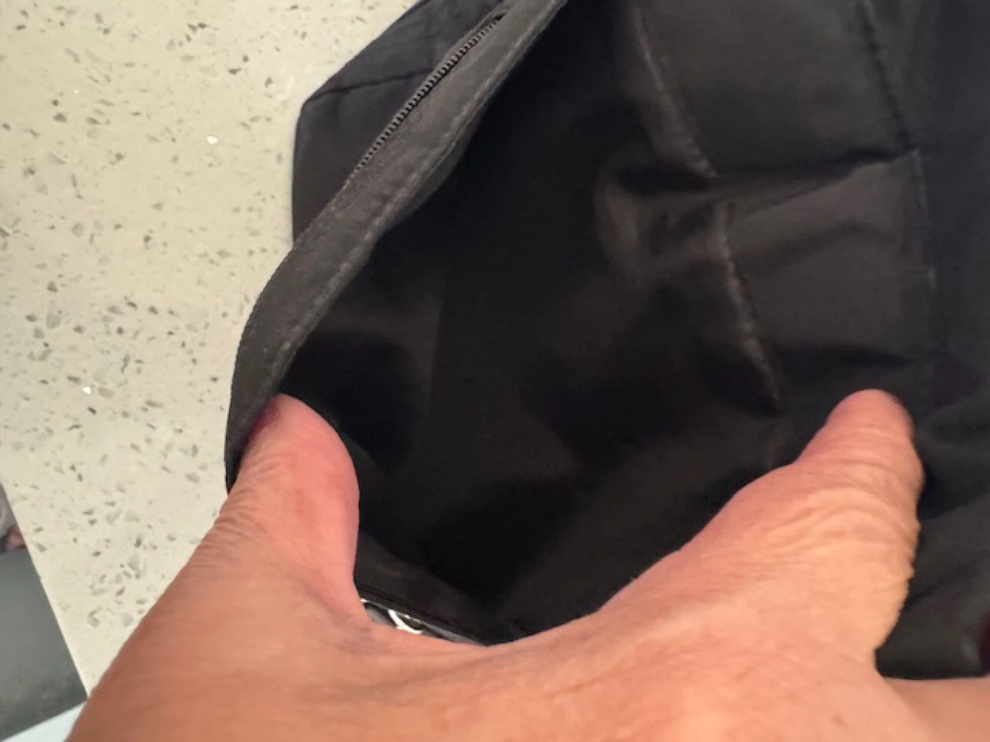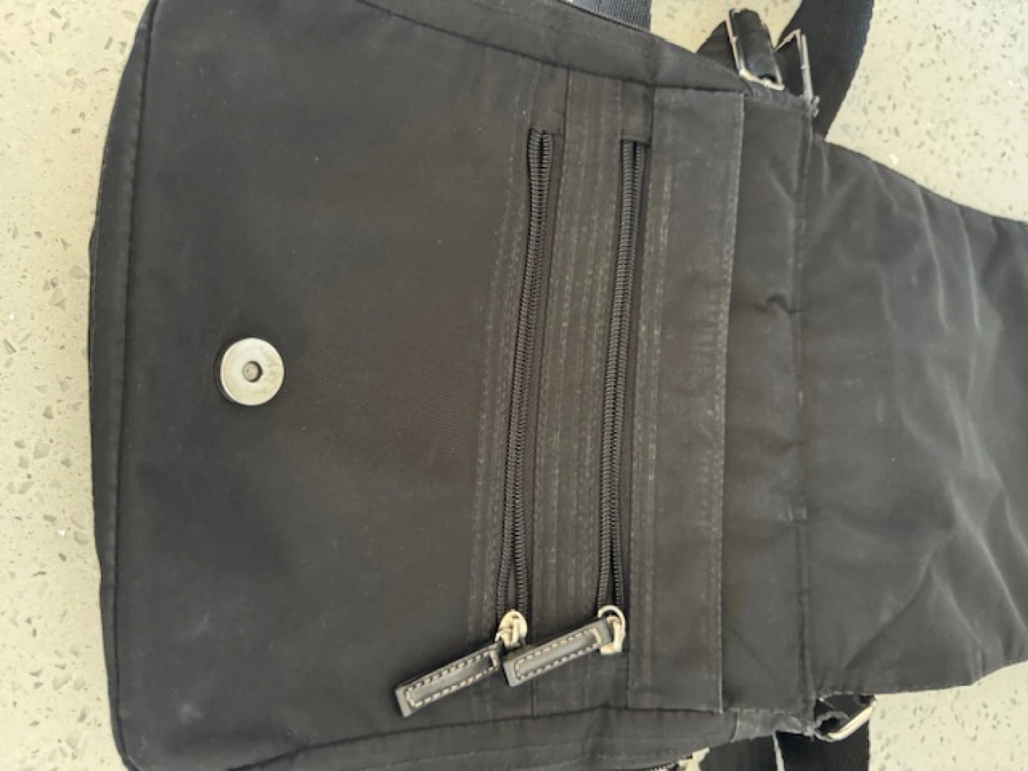 Selling a black crossbody bag! It's in good condition and has a few different zippered compartments. Perfect for carrying your essentials while keeping your hands free.