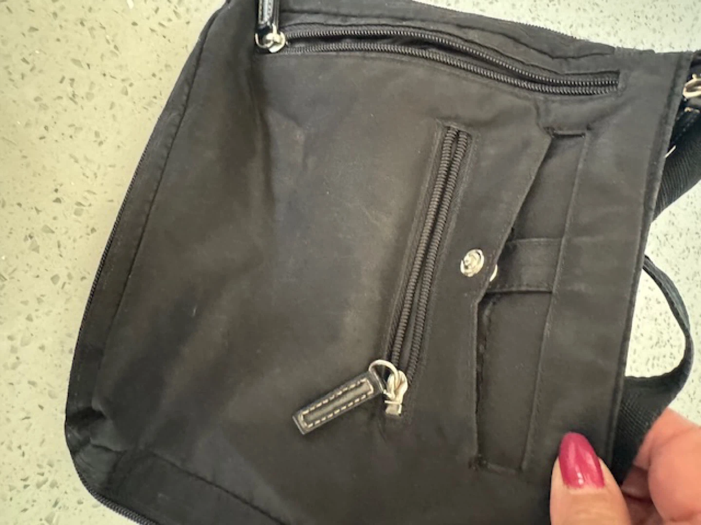 Selling a black crossbody bag! It's in good condition and has a few different zippered compartments. Perfect for carrying your essentials while keeping your hands free.
