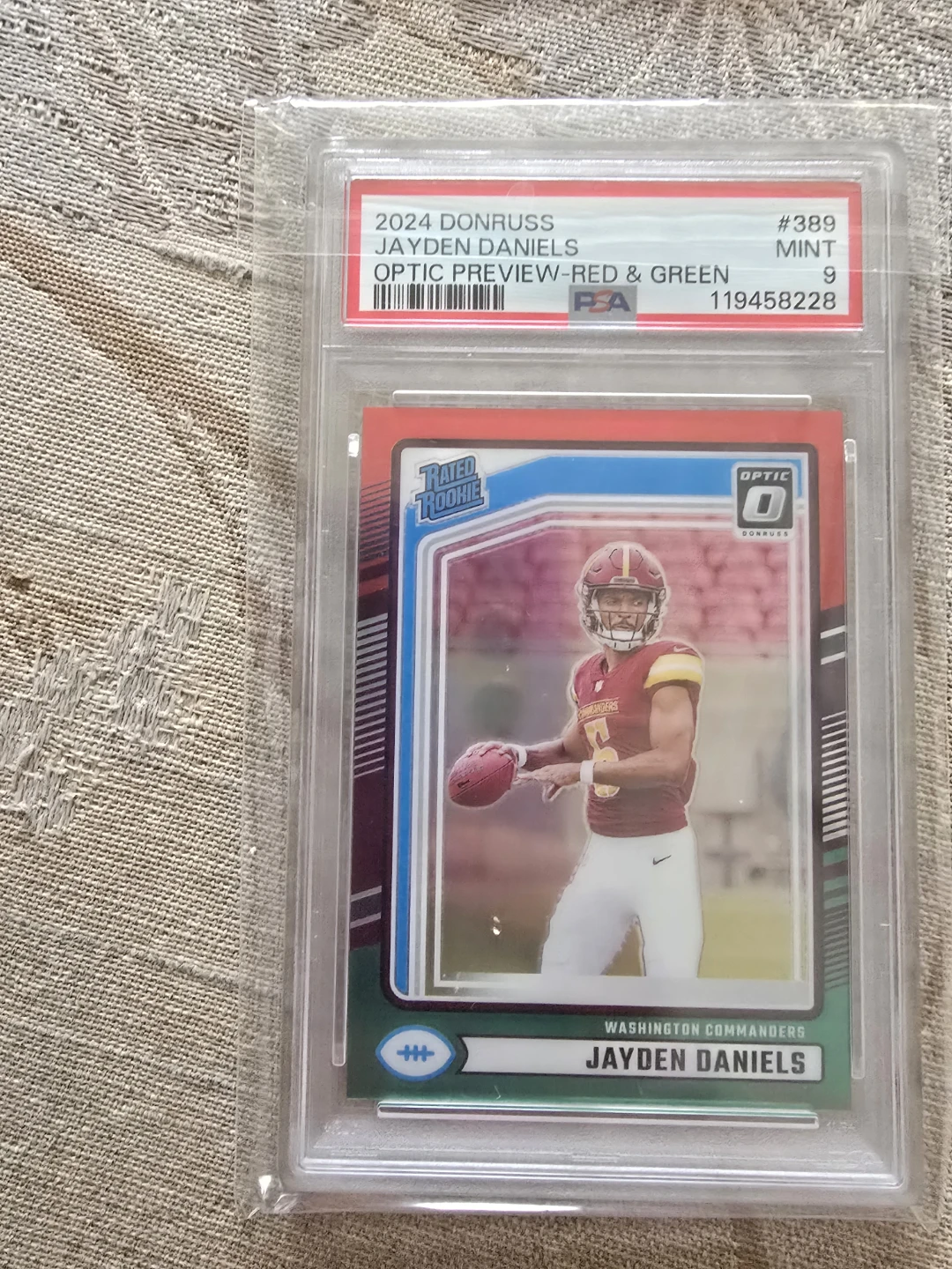 This is a 2024 Donruss Optic Preview card featuring Jayden Daniels. It's from the Red & Green set and is graded Mint 9 by PSA. The card number is #389.