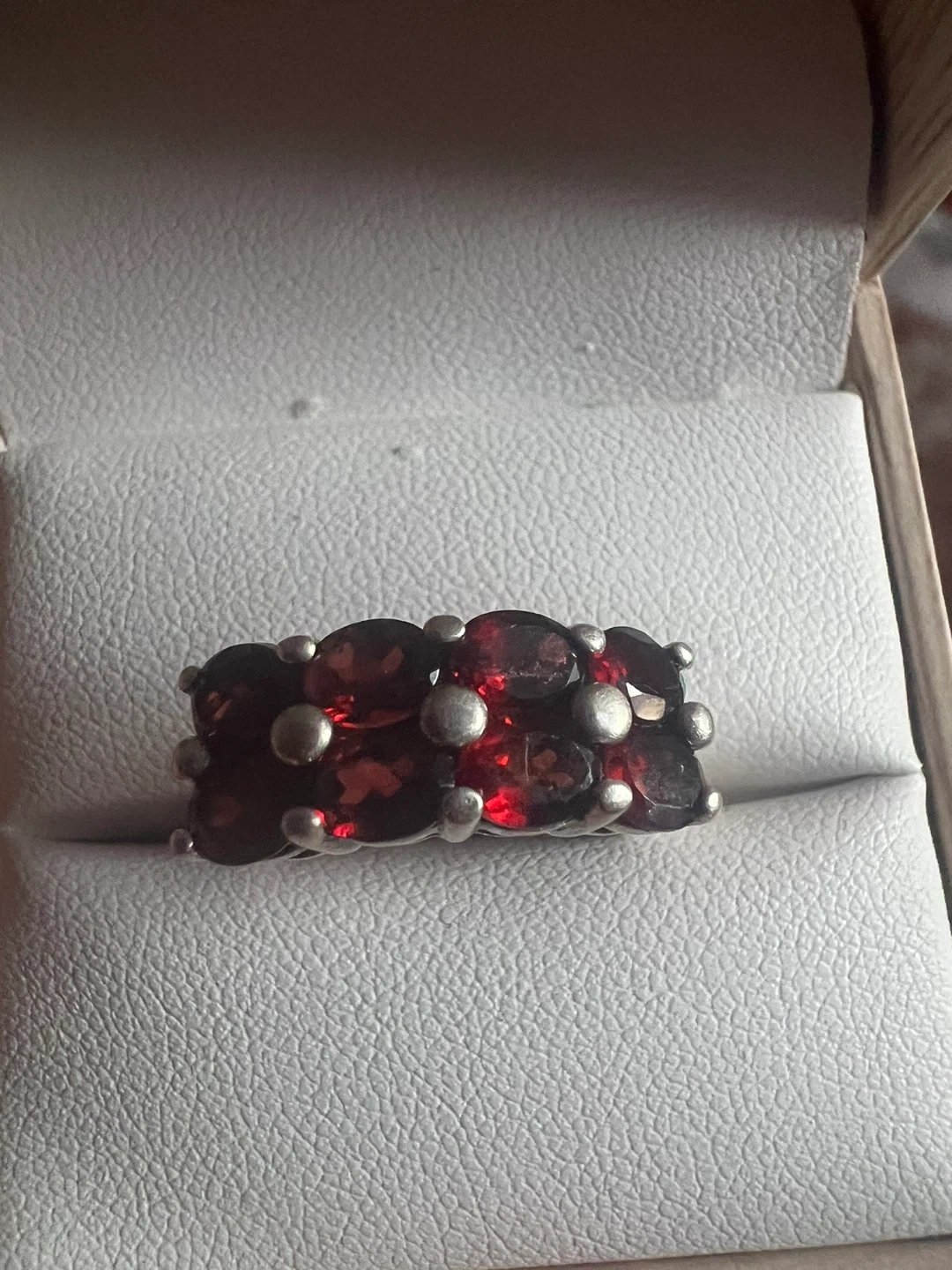 925 silver ring featuring multiple oval-cut garnets. The stones are set in a cluster design with small silver beads accenting the setting. A lovely piece for any jewellery collection!