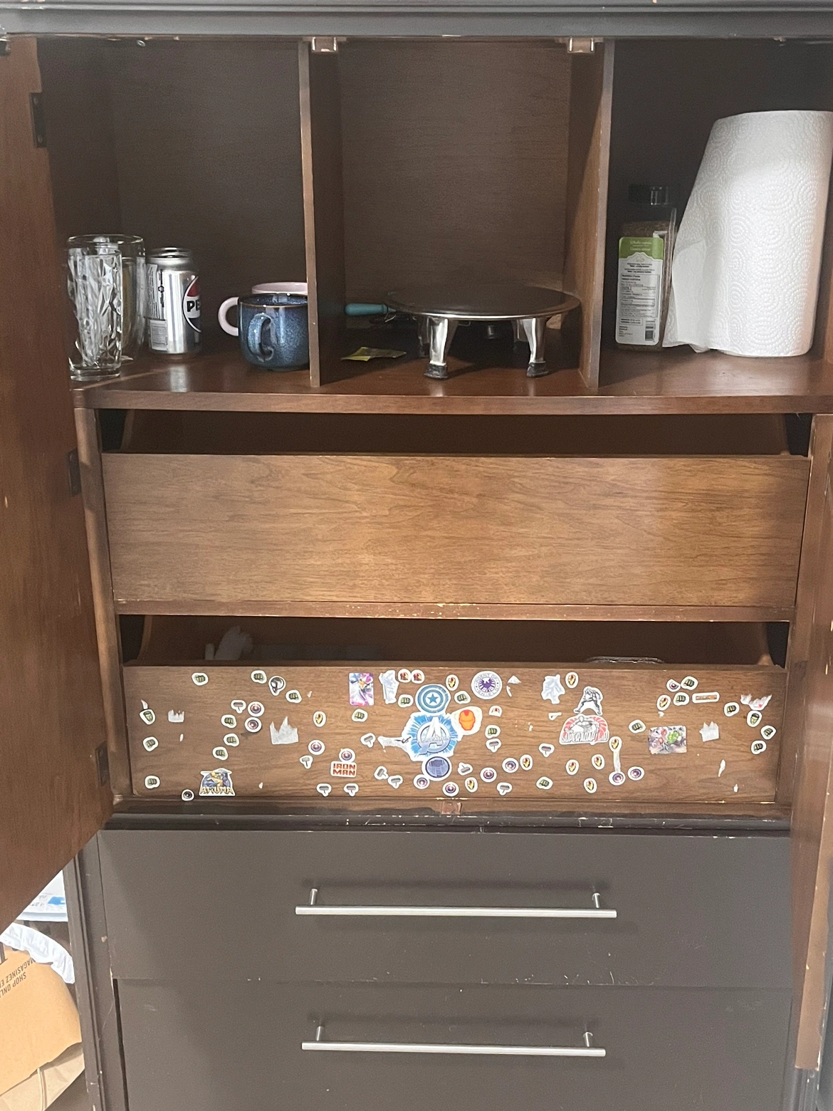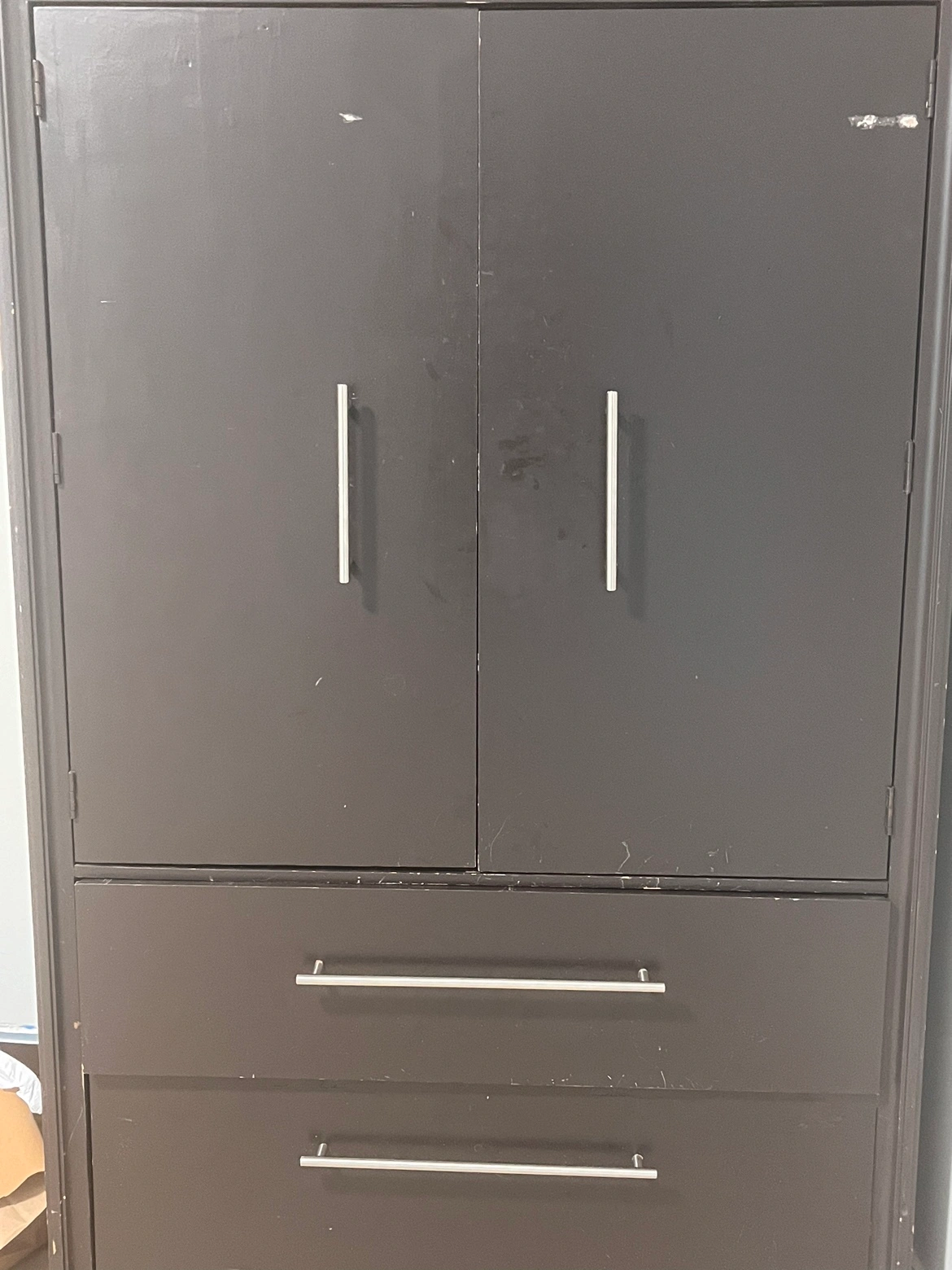 This cupboard is in good condition and has 2 doors, 2 drawers, and shelving. It is perfect for a bedroom, living room, or dining room.