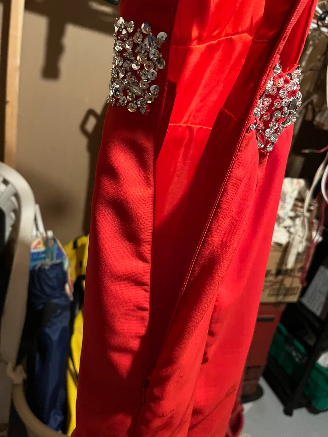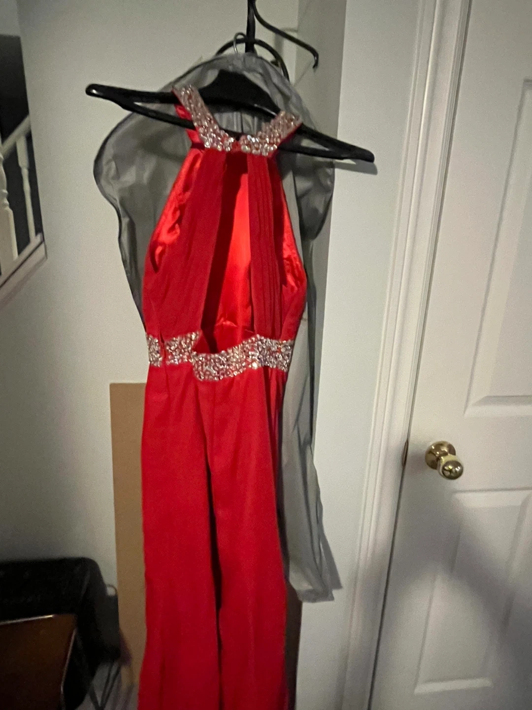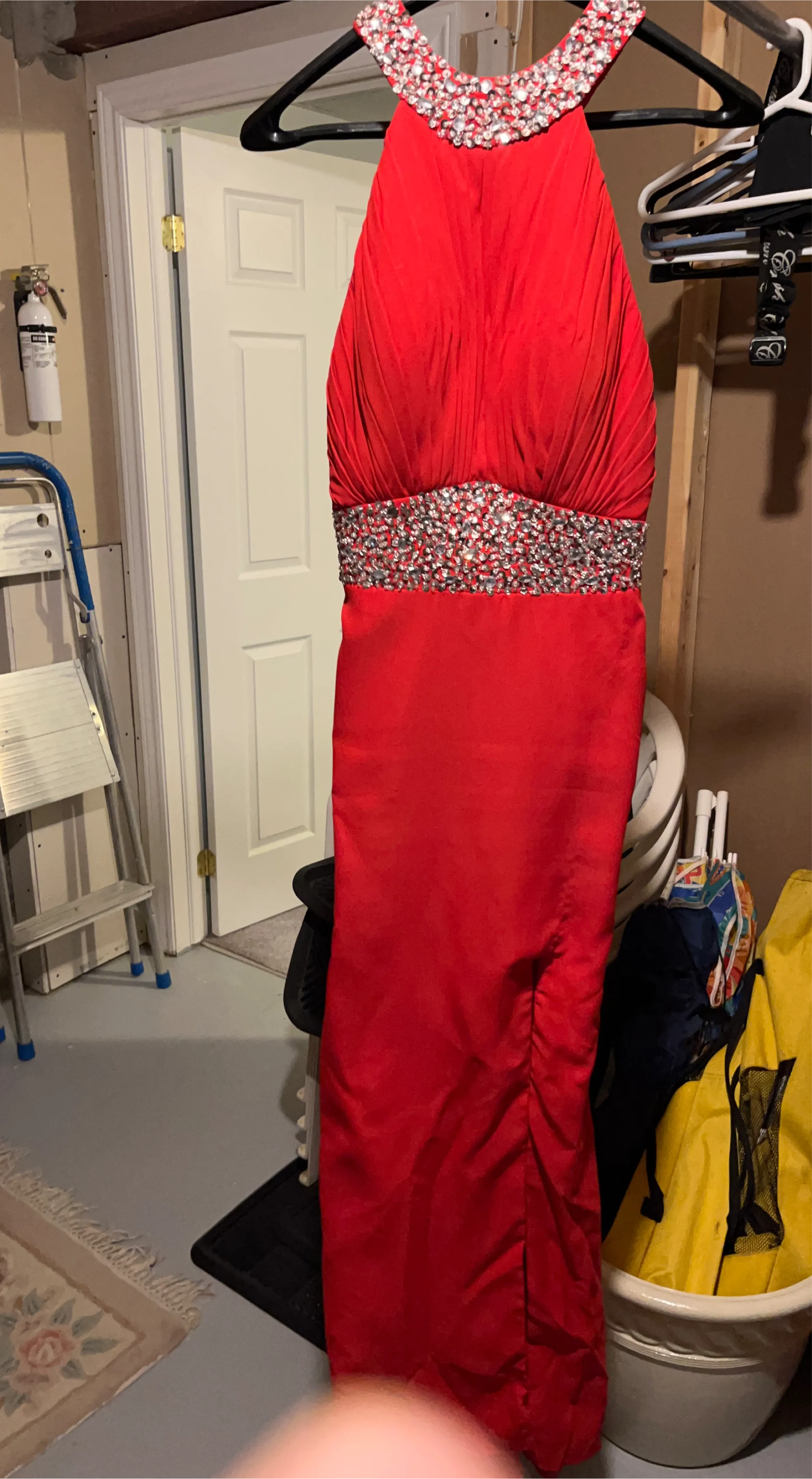 Stunning red formal dress with a halter neckline and dazzling rhinestone embellishments at the collar and waist. Features a flattering ruched bodice and a side slit for elegant movement. Side zip closure.