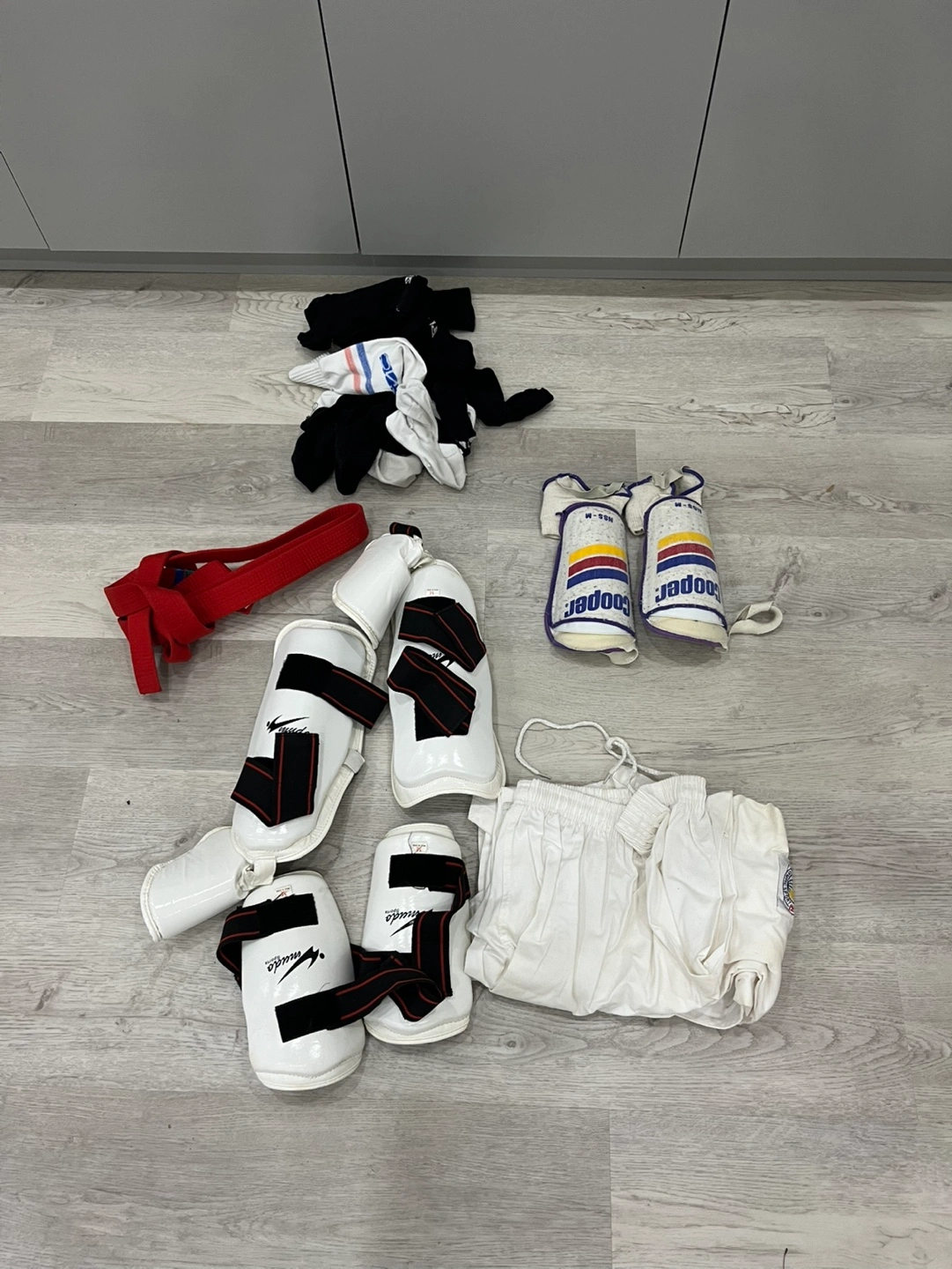 Used martial arts equipment bundle. Includes shin guards, forearm guards, a red belt, and a white uniform. Some socks included. Good condition. Cooper brand forearm guards. Winma brand shin guards.