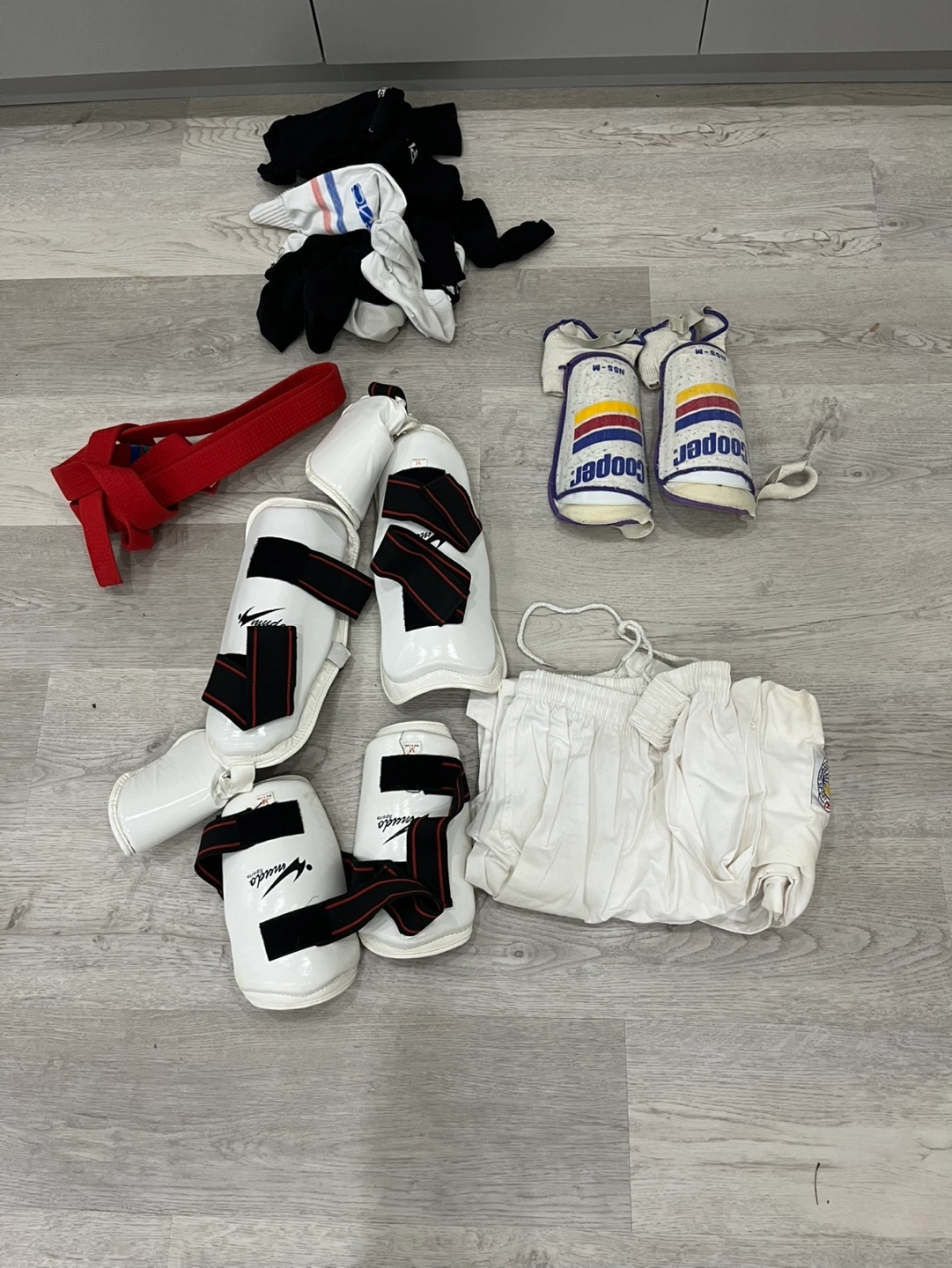 Used martial arts equipment bundle. Includes shin guards, forearm guards, a red belt, and a white uniform. Some socks included. Good condition. Cooper brand forearm guards. Winma brand shin guards.