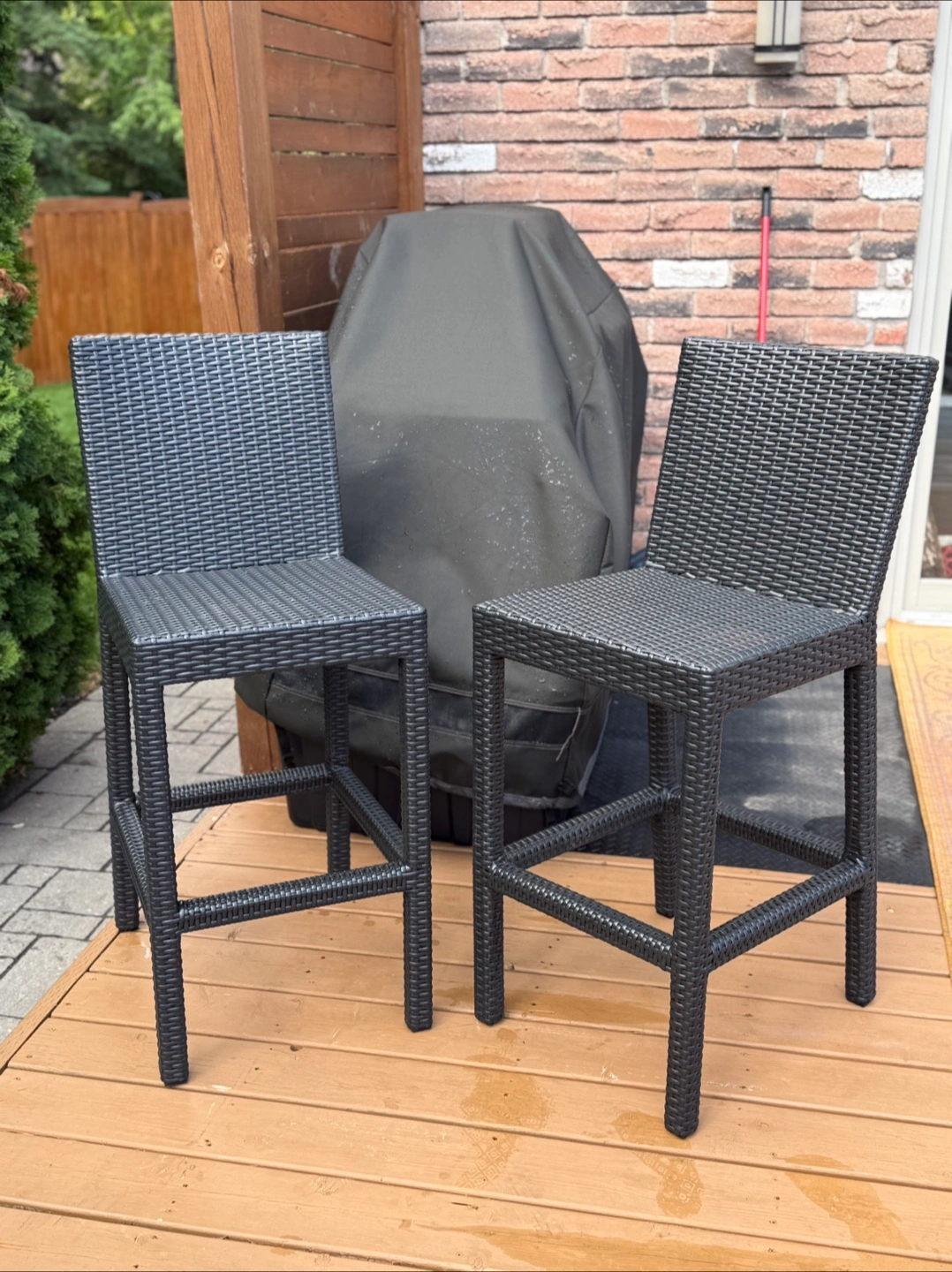 Selling a set of two black wicker bar stools from PMJ Collection. They're perfect for your patio or bar area. The wicker material gives them a stylish look, and they're super sturdy. Great for outdoor or indoor use!