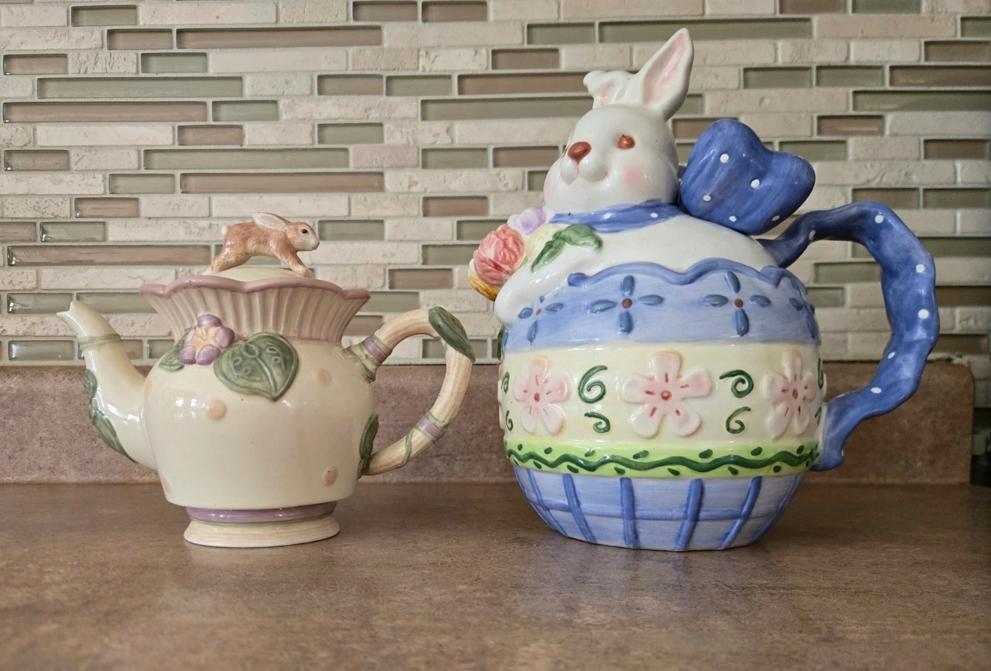 Two ceramic teapots with charming Easter bunny and floral designs. The larger teapot features a blue polka dot bow and a round body. The smaller one has a little bunny on top and pastel accents. They're perfect for seasonal decor or a fun tea party! Not sold as a pair.