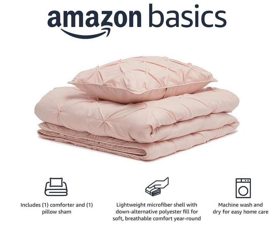 Dress your bed in simple, sophisticated style with this Amazon Basics King Comforter Bedding Set in blush pink featuring a stylish, pintuck design. This set includes one comforter and one pillow sham. The comforter is made of soft, brushed microfiber with a down-alternative polyester fill for year-round comfort. Being brand new, this bedding set offers a fresh and inviting update to any bedroom decor.