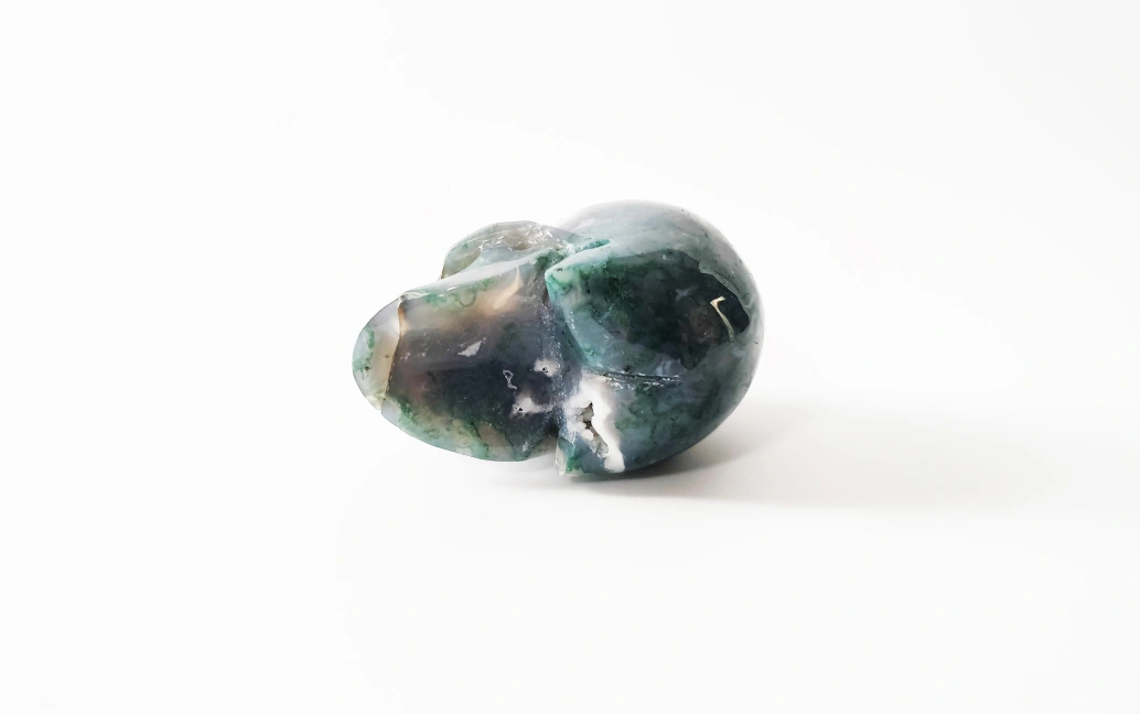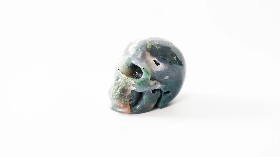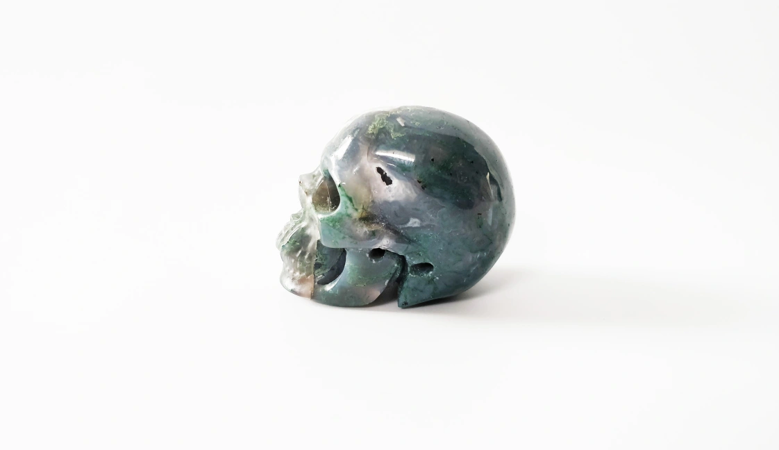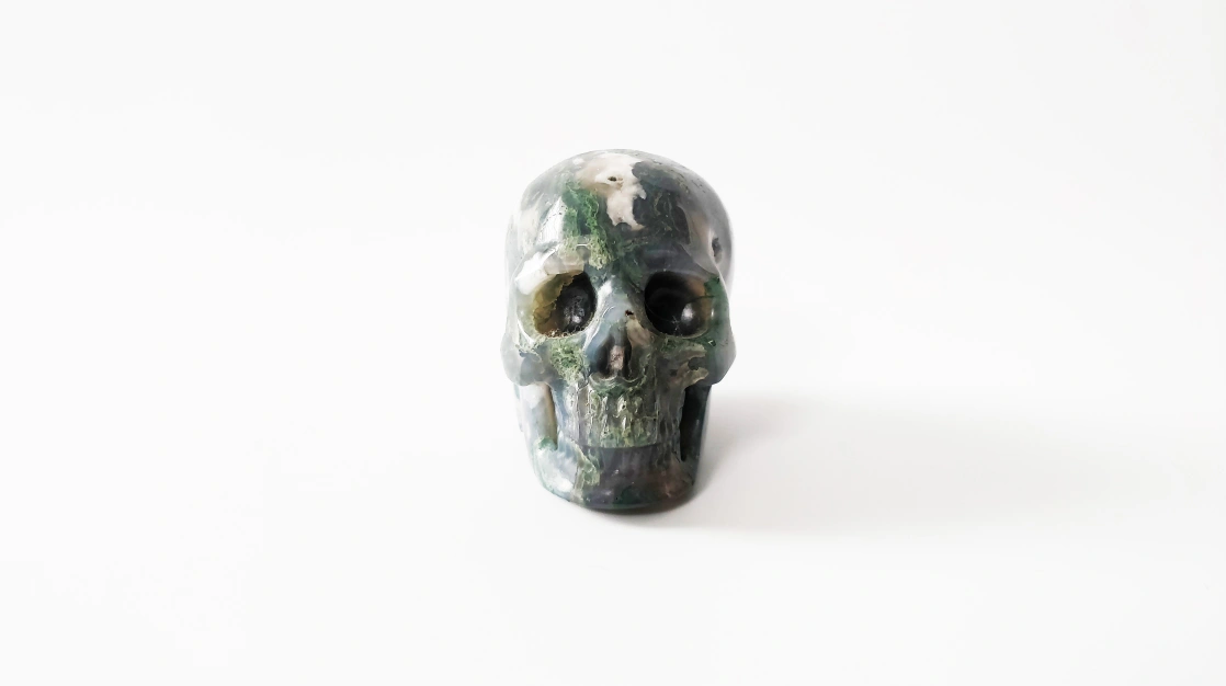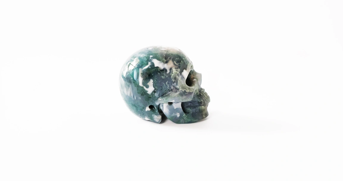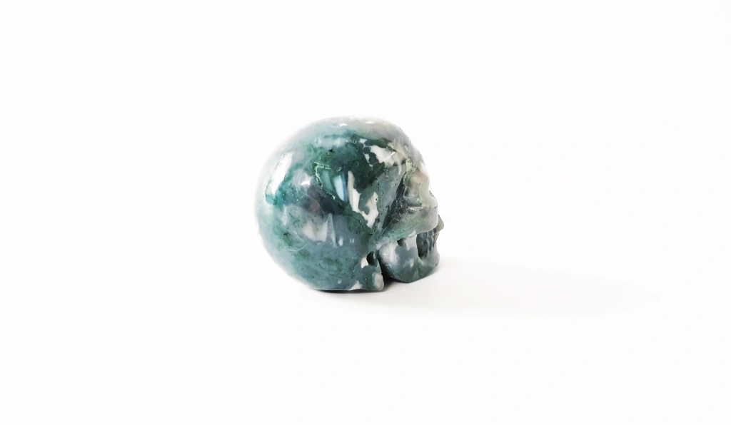 Memento Mori Skull Carving Green Moss Agate Crystal Gemstone